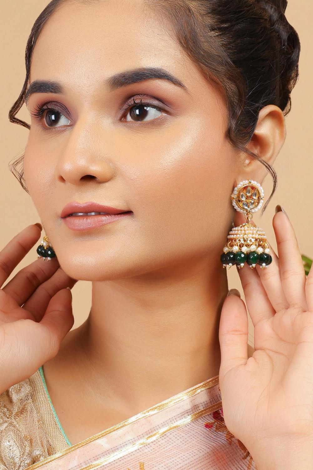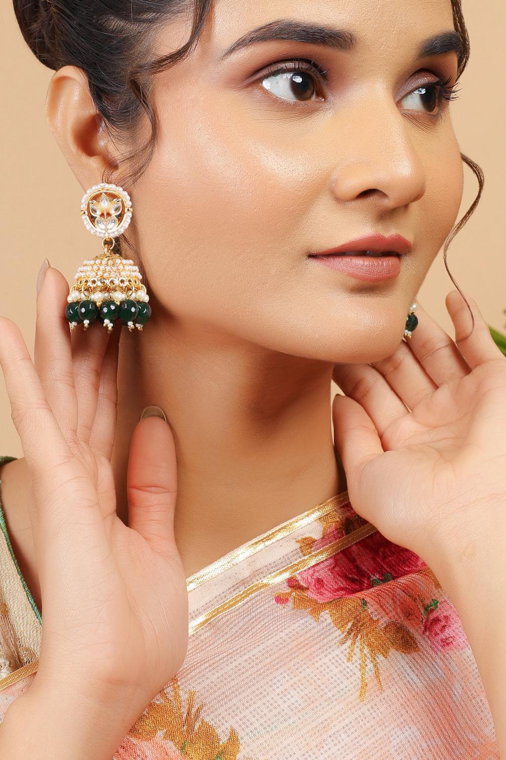 Unveil your inner diva with our Earrings a masterpiece that combines artistry and sophistication. Made from Alloy this jewelry is adorned with Kundan & on back side meenakari comes ensuring a dazzling finish. Whether you're dressing up for Sangeet, Mehendi, Wedding or adding flair to casual wear, this piece is your ultimate style companion. Pair it with modern accessories to complete your outfit and make every moment sparkle
