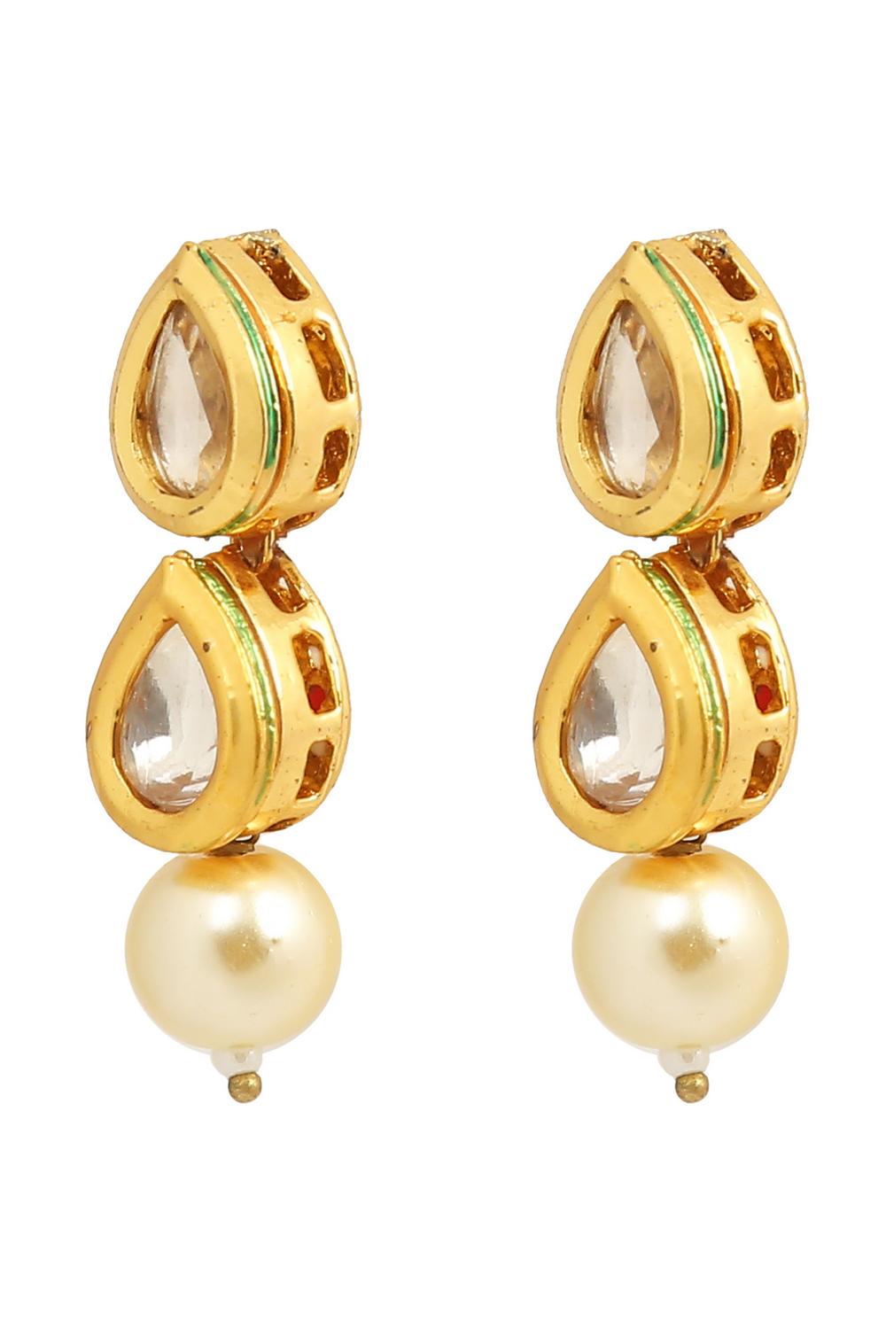 Unveil your inner diva with our Earrings a masterpiece that combines artistry and sophistication. Made from Alloy this jewelry is adorned with Kundan & on back side meenakari comes ensuring a dazzling finish. Whether you're dressing up for Sangeet, Mehendi, Wedding or adding flair to casual wear, this piece is your ultimate style companion. Pair it with modern accessories to complete your outfit and make every moment sparkle