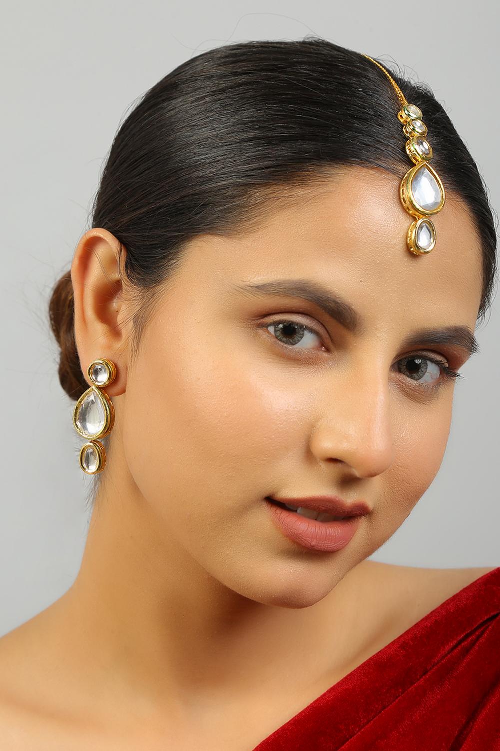 Unveil your inner diva with our Earrings with Maang Tikka a masterpiece that combines artistry and sophistication. Made from Alloy this jewelry is adorned with Kundan & on back side meenakari comes ensuring a dazzling finish. Whether you're dressing up for Sangeet, Mehendi, Wedding or adding flair to casual wear, this piece is your ultimate style companion. Pair it with modern accessories to complete your outfit and make every moment sparkle