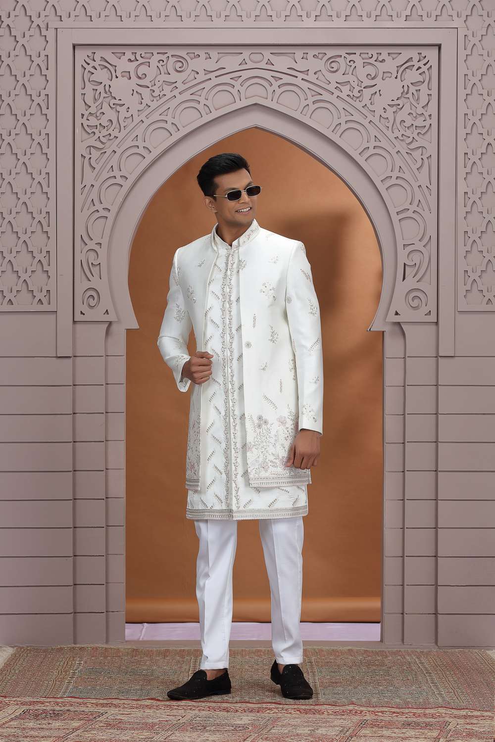 Men's Cream Embroidered Art Silk Sherwani Sets