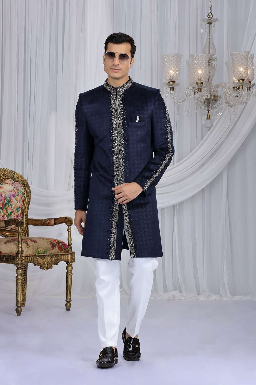 Men's Navy Blue Embroidered Velvet Sherwani Sets