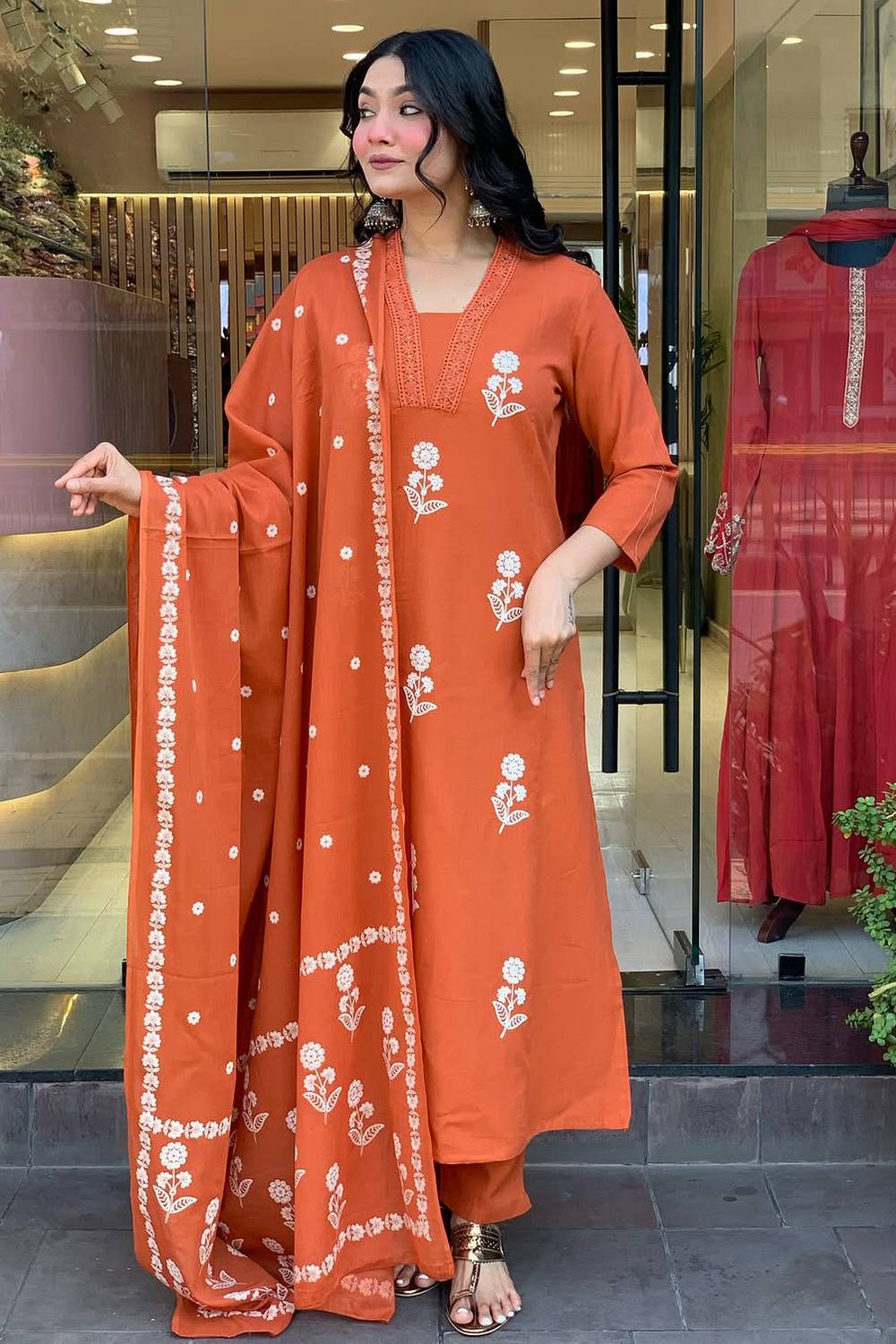 Orange Floral Embroidered Cotton Kurti Pant Set