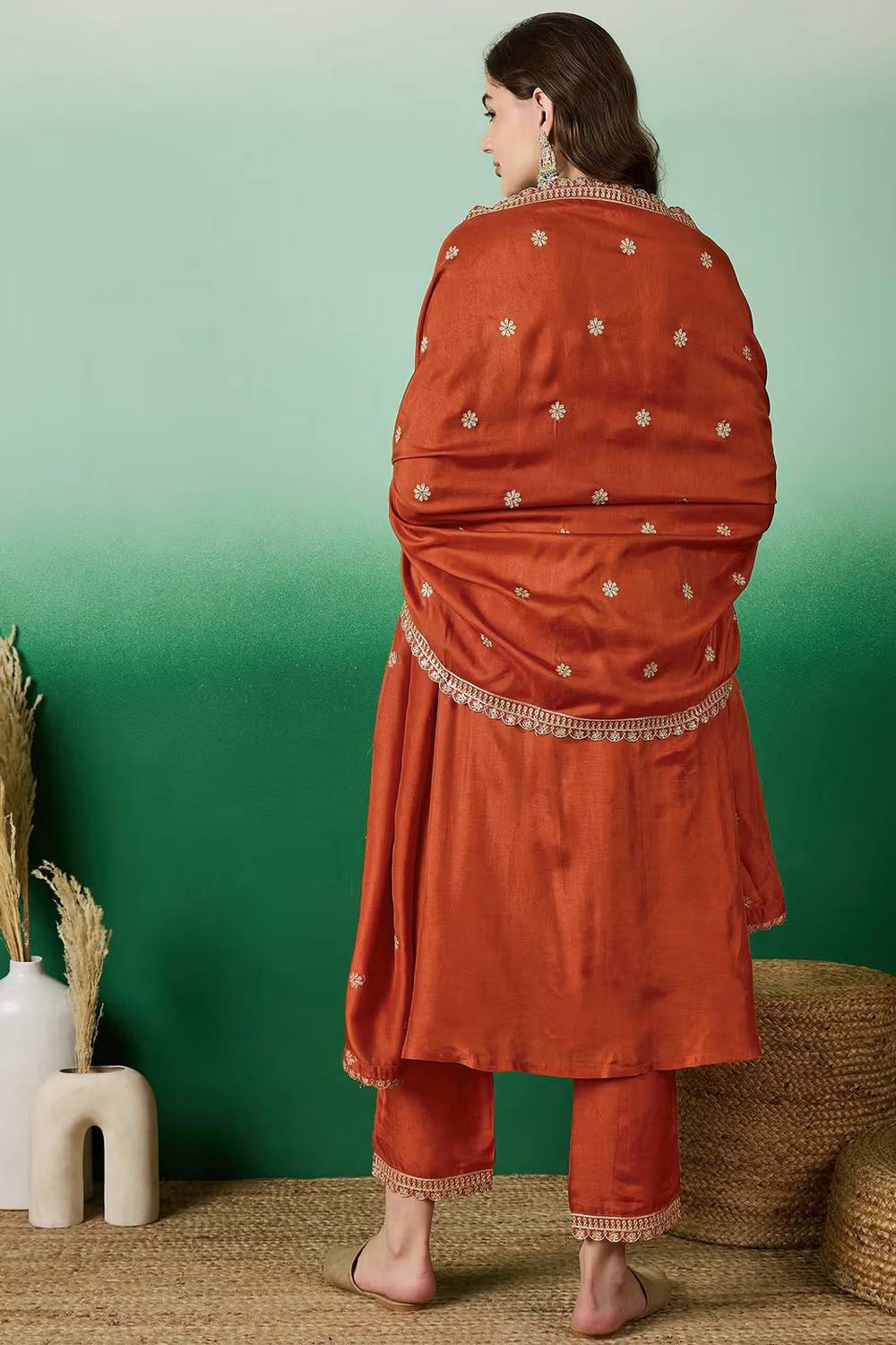Orange Floral Embroidered Silk Anarkali Suit Set
