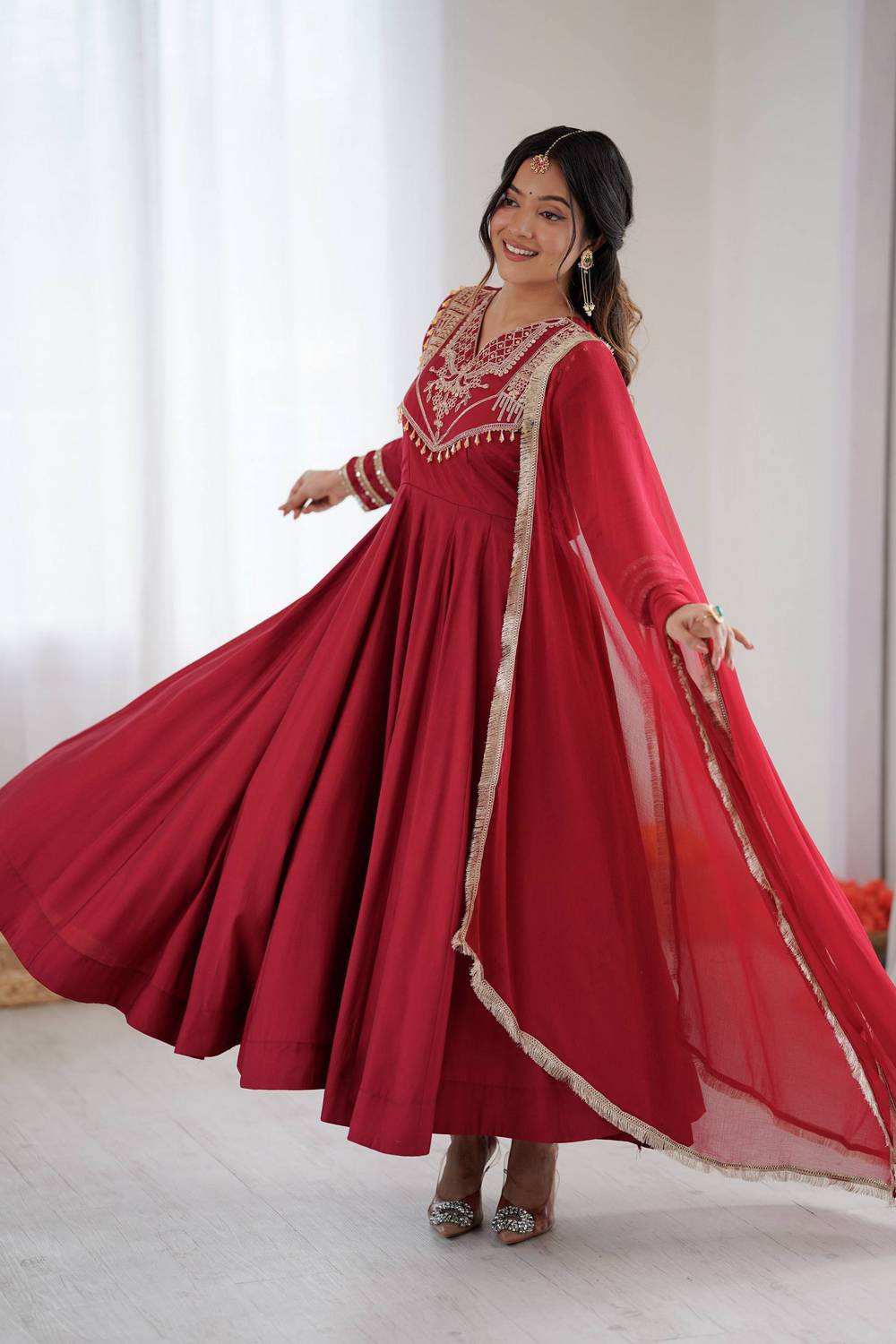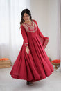 Step into effortless style with our Anarkali Suits crafted for the modern woman who cherishes tradition. Made from soft Silk it keeps you comfortable all day long. The Embroidered design lends a touch of sophistication to your outfit. Perfect for Festive this is a must-have for versatile styling options. Style it with minimalistic accessories and flats for a casual look or jewelry and heels for special events