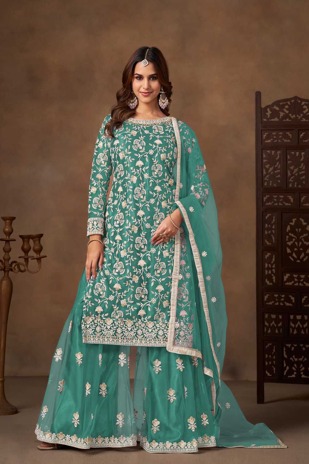 Sea Green Floral Embroidered Net Palazzo Suits (Blouse Semi-Stiched)