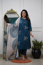 Turquoise Floral Embroidered Silk Kurti Pant Set