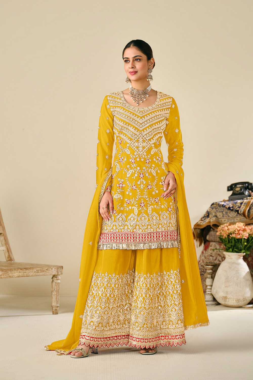 Yellow Floral Embroidered Chinon Palazzo Suits