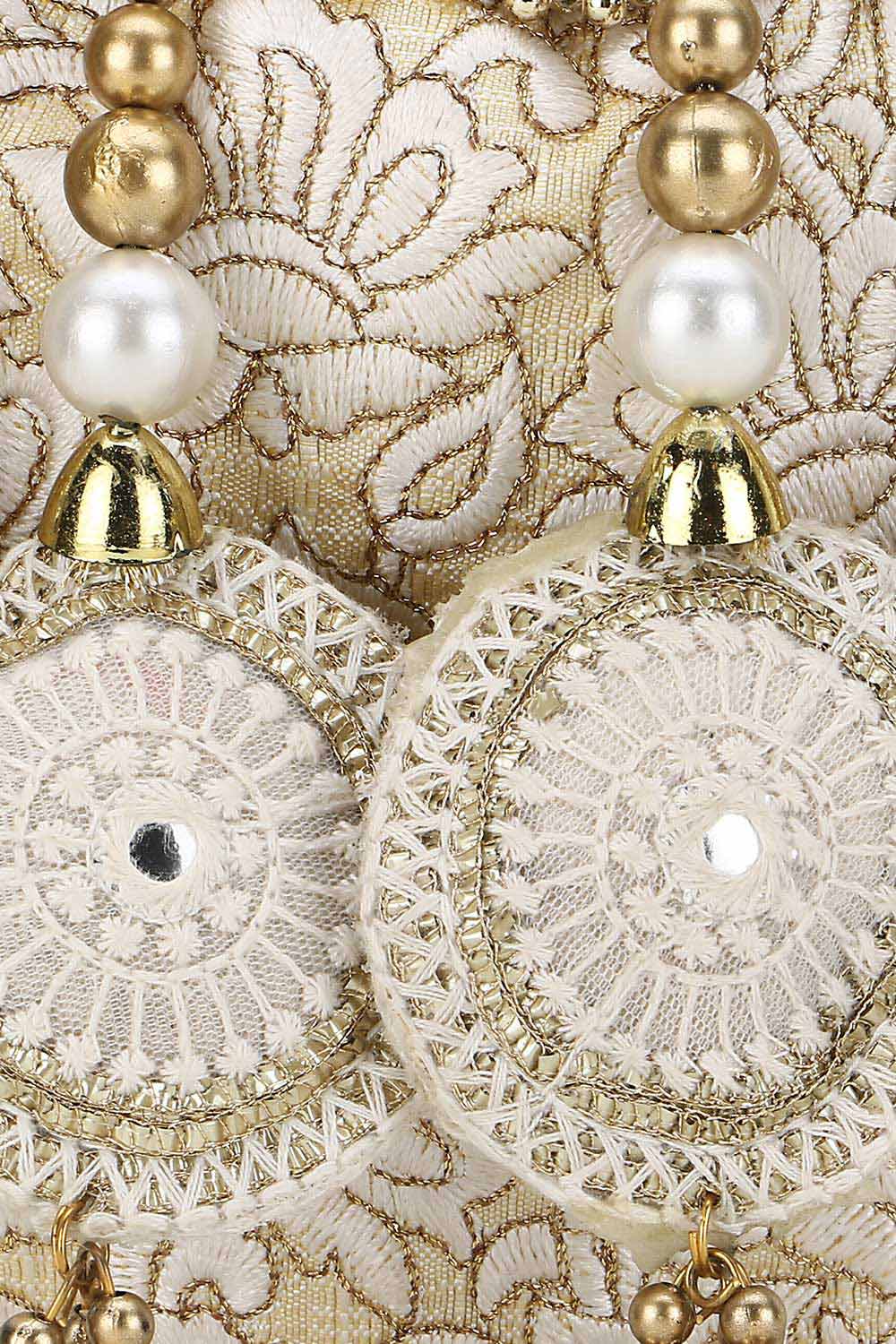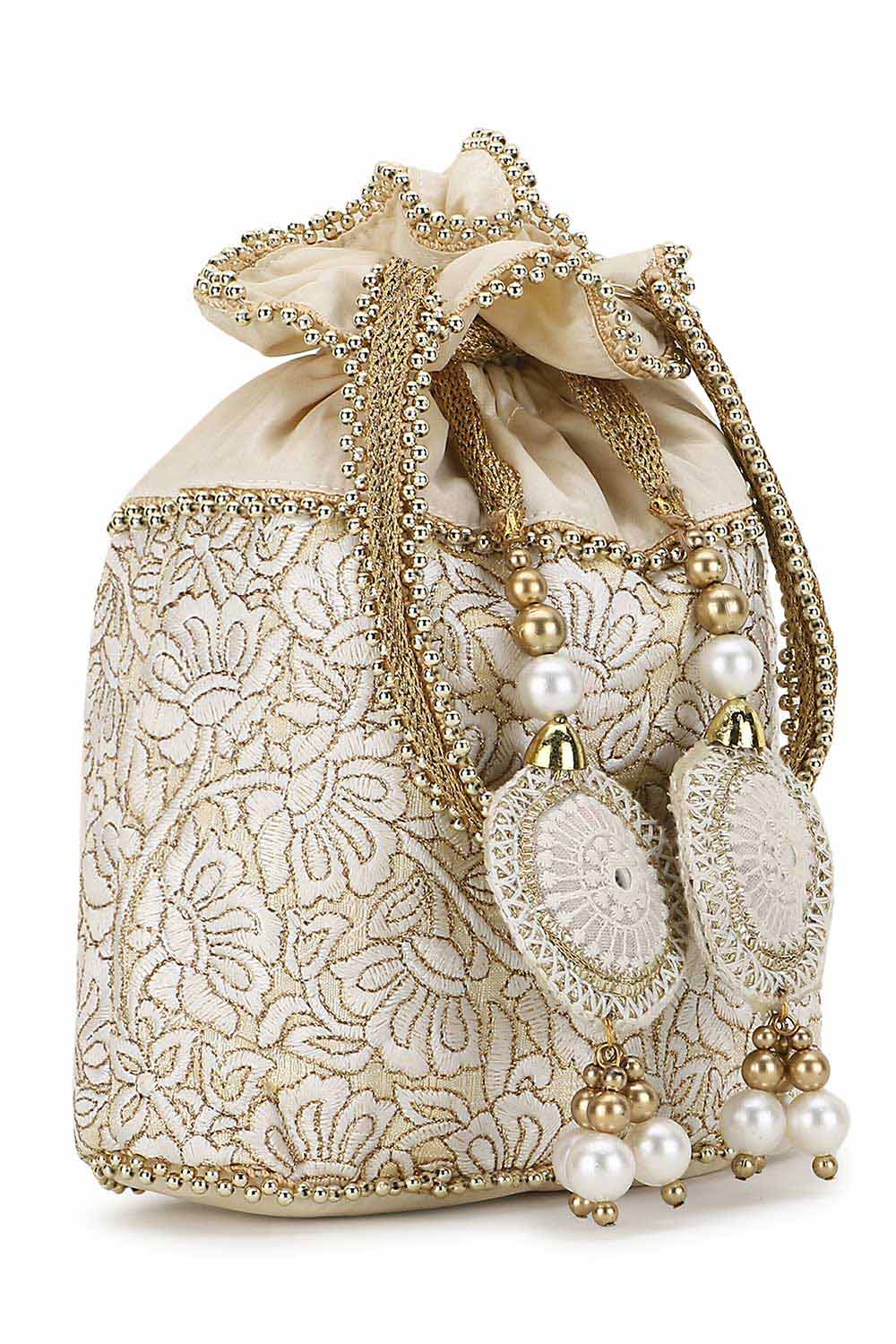 Cream And Gold Faux Silk Floral Embroidered Tasseled Potli