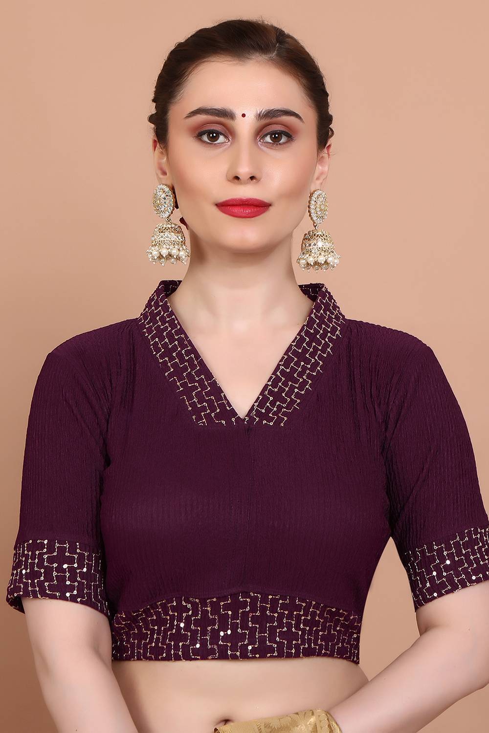 Transform your saree look with our Blouse the ultimate blend of style and comfort. Made from soft and breathable Lycra it ensures a snug yet flexible fit. The intricate Embroidered make this blouse a wardrobe essential. Perfect for Festive it works beautifully with traditional or modern sarees alike. Team it with a silk saree, a bold necklace, and embellished sandals for a sophisticated look. Redefine your saree style with Blouse