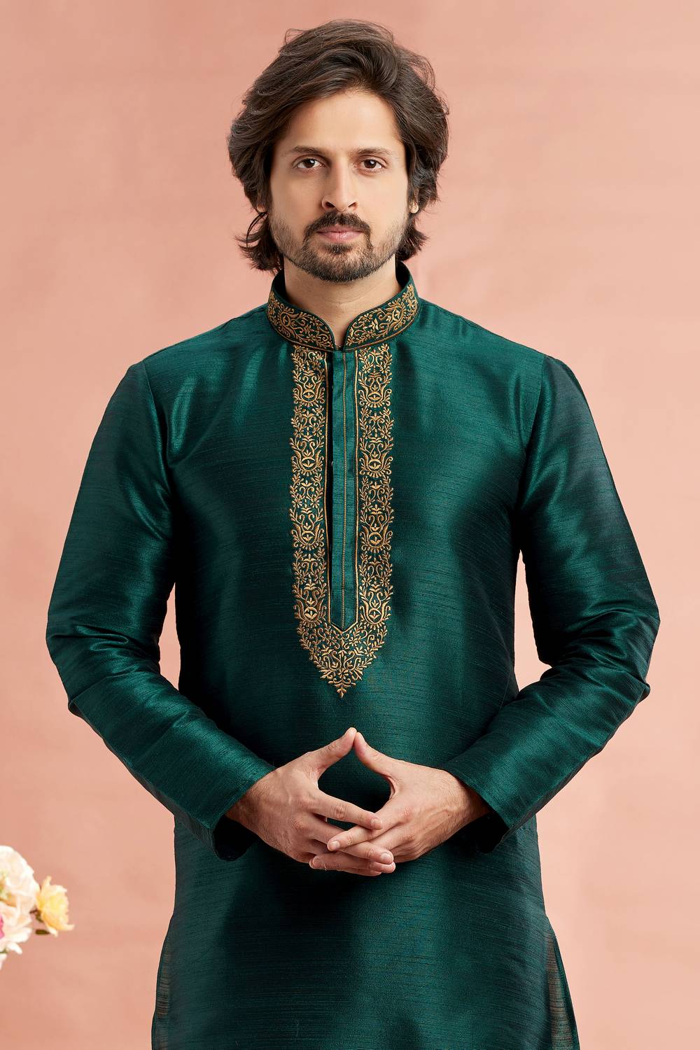 Men's Green Embroidered Raw Silk Kurta Pyjama Set