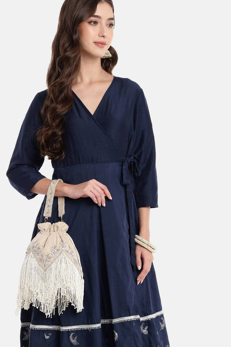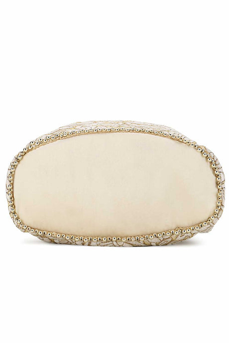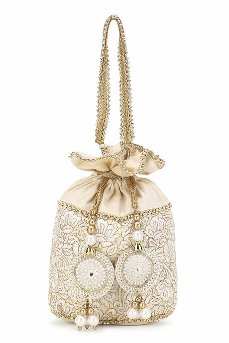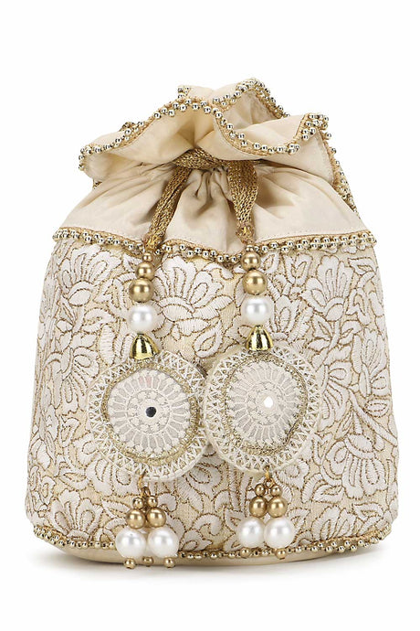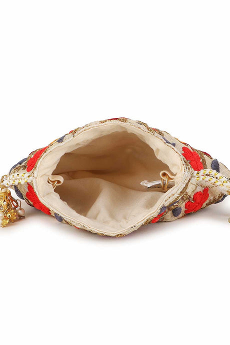 Cream And Gold Faux Silk Floral Embroidered Tasseled Potli