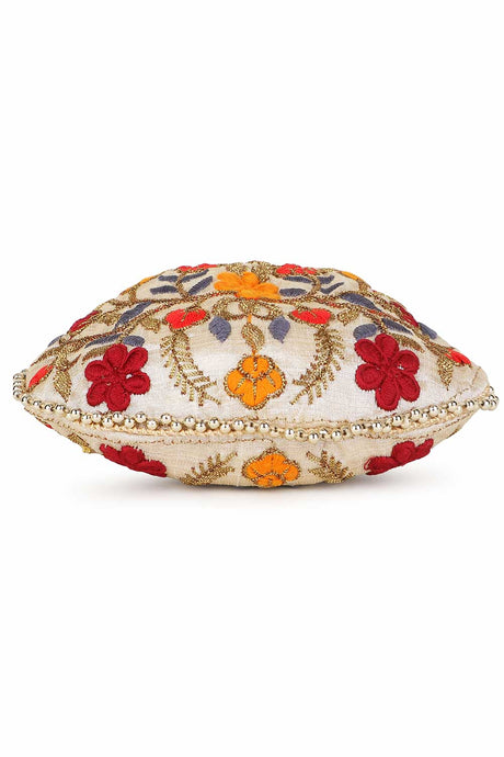 Cream And Multi Faux Silk Floral Embroidered Potli