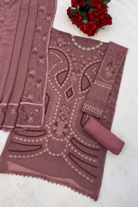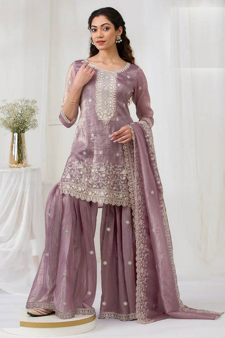 Mauve Floral Embroidered Georgette Palazzo Suits