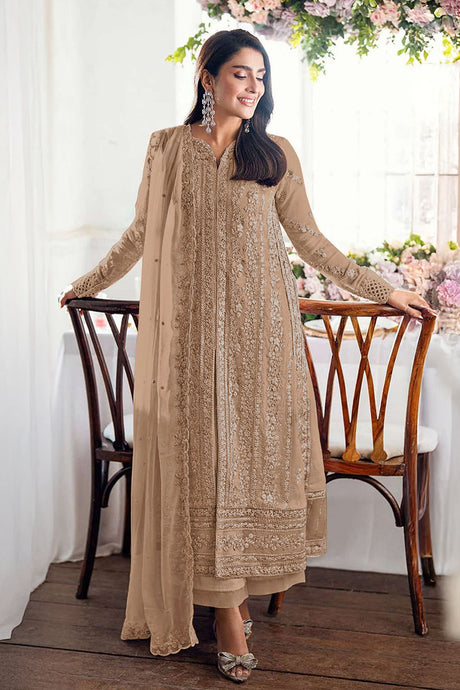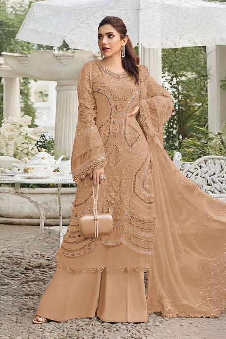 Beige Floral Embroidered Georgette Palazzo Suits