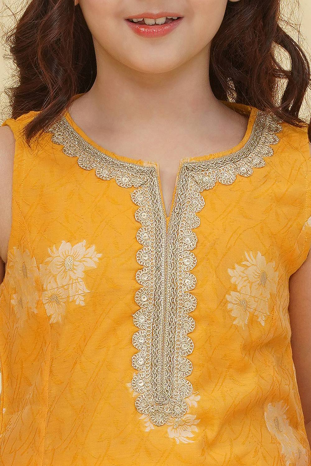 Girl's Yellow Floral Printed Silk Kurta Set