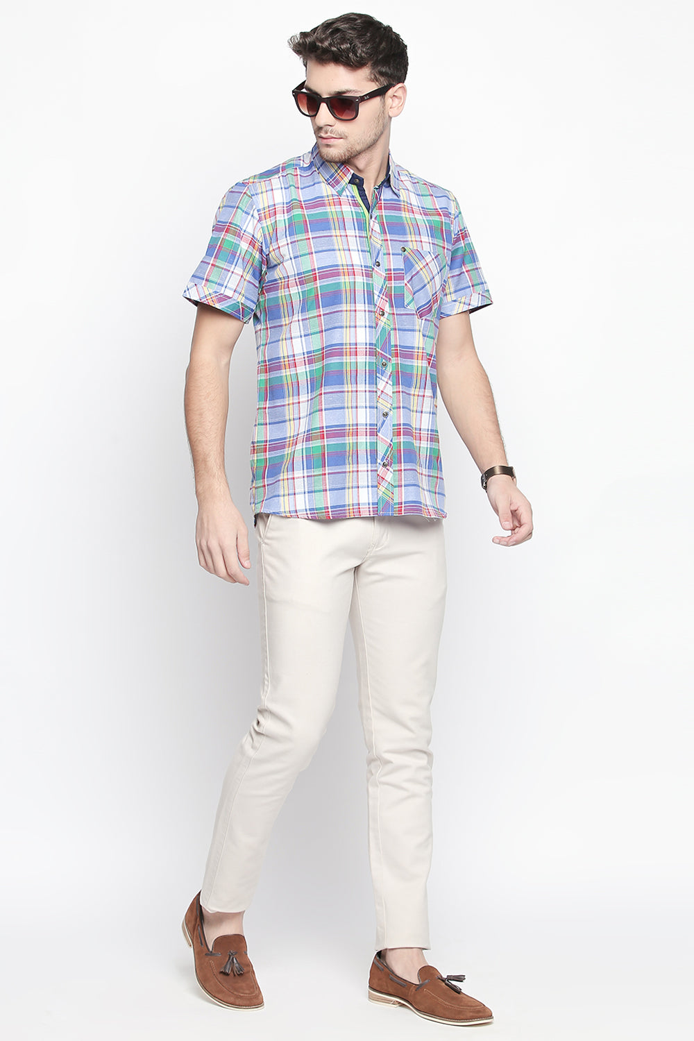 Blue, White and Red cotton multicolor vintage style checks short shirt with metal buttons and show stitches.
