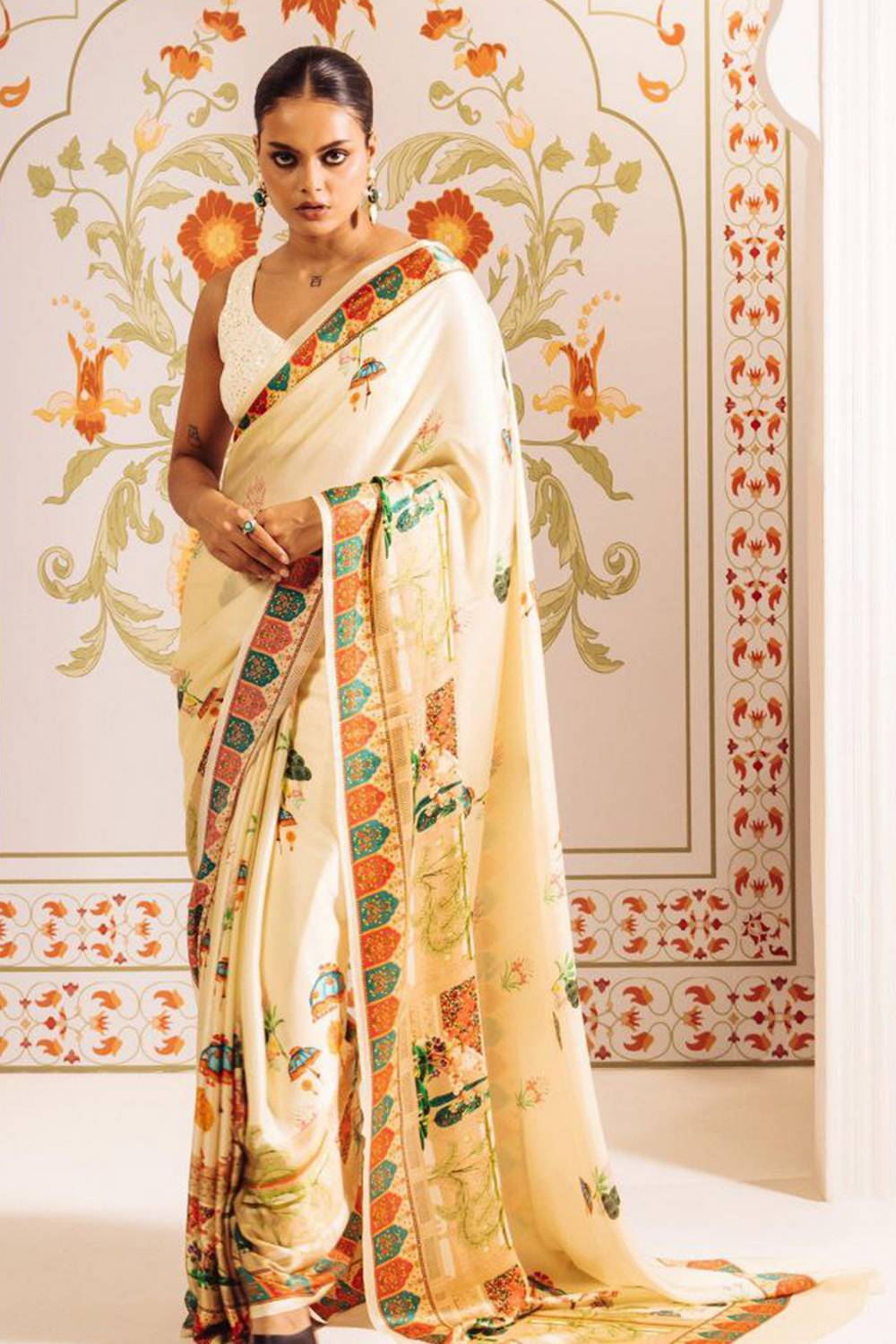 Elevate your wardrobe with our exquisite Saree a masterpiece crafted to add timeless elegance to your style. Made from Satin this saree offers a perfect mix of comfort and sophistication. Adorned with Printed it showcases intricate craftsmanship that speaks volumes of tradition and artistry. Perfect for Casual this saree is a versatile addition to your collection, ensuring you stand out effortlessly. Pair it with elegant Jewelry, for a glamorous look. Add Clutches or Potli Bags and complete the ensemble with Wedges & Heels , making it a perfect choice for any event. Make a statement and embrace the elegance of Saree Today