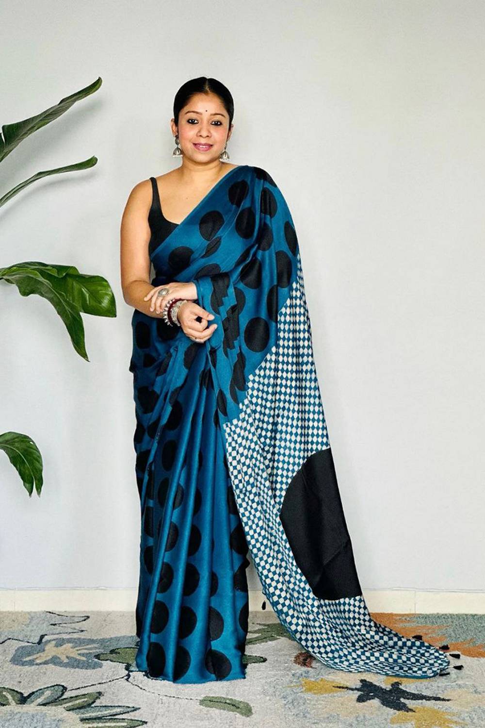 Elevate your wardrobe with our exquisite Saree a masterpiece crafted to add timeless elegance to your style. Made from Satin this saree offers a perfect mix of comfort and sophistication. Adorned with Printed it showcases intricate craftsmanship that speaks volumes of tradition and artistry. Perfect for Casual this saree is a versatile addition to your collection, ensuring you stand out effortlessly. Pair it with elegant Jewelry, for a glamorous look. Add Clutches or Potli Bags and complete the ensemble with Wedges & Heels , making it a perfect choice for any event. Make a statement and embrace the elegance of Saree Today
