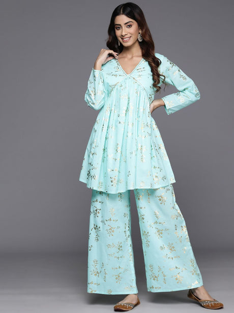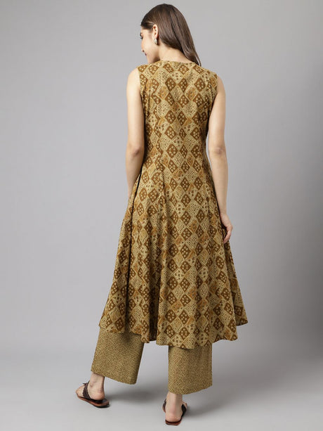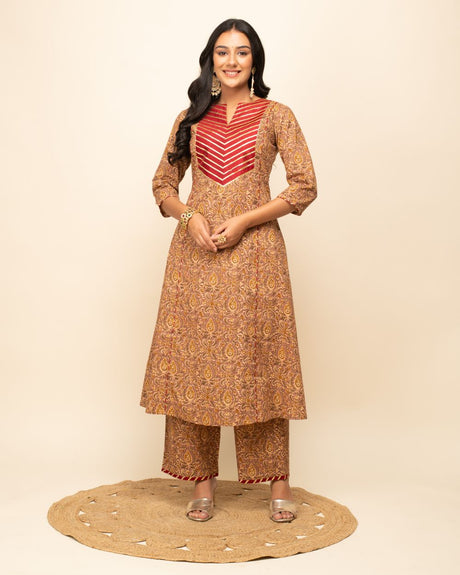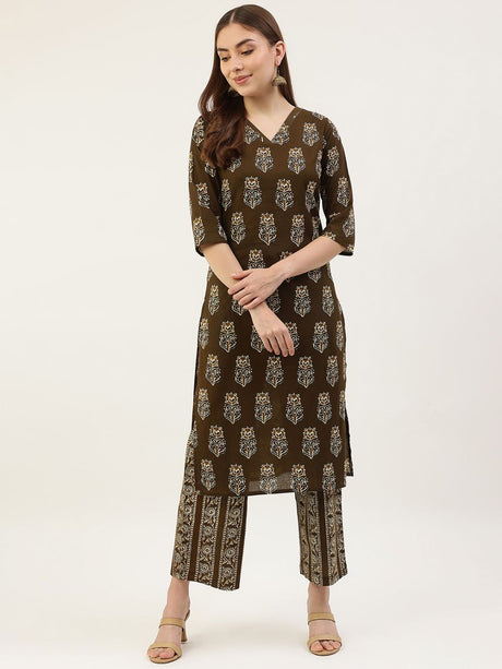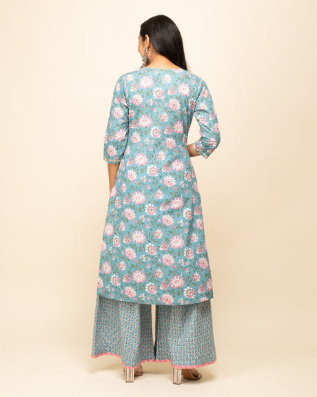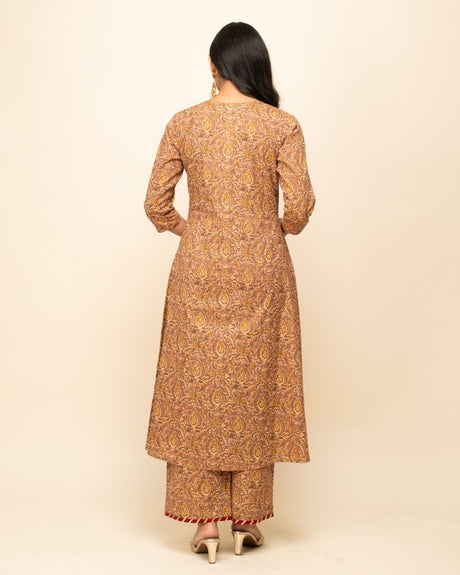 Steel Grey Gold Printed Straight Palazzo Suit Set With Pockets