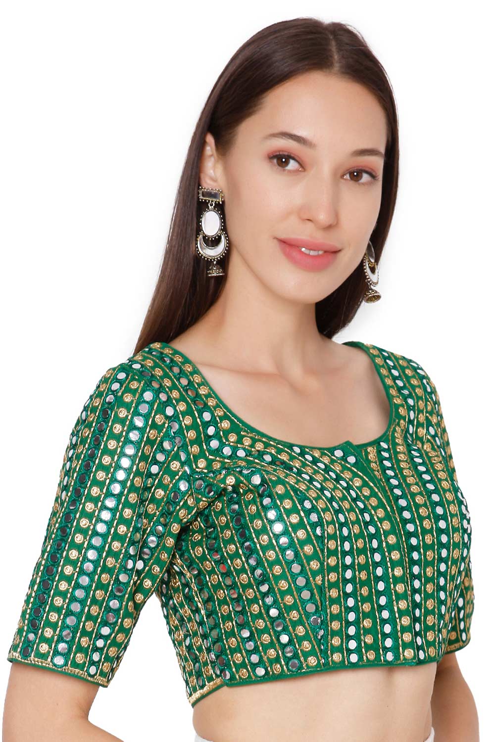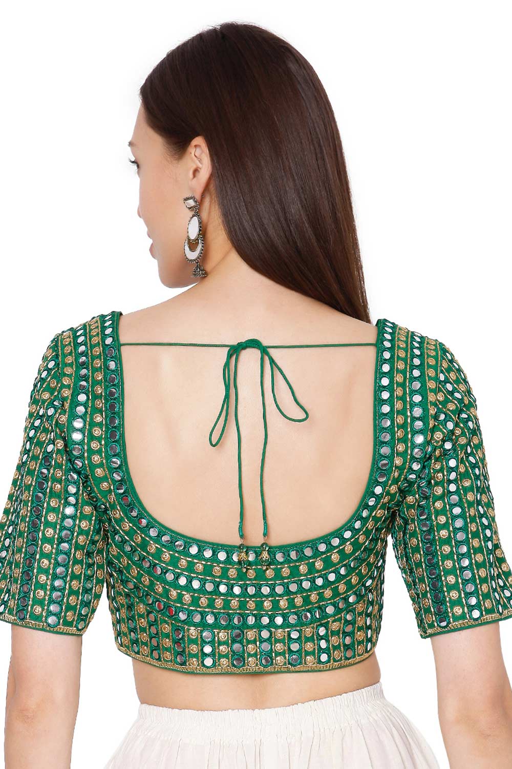 Green Slub Silk Mirror Embellished Embroidered Readymade Saree Blouse