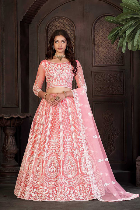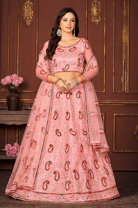 Peach Chinon Crochet Embroidered Lehenga Choli With Dupatta