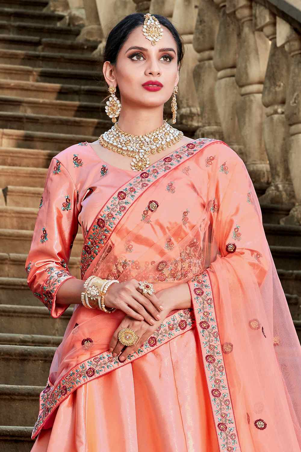 A Must Have Beautiful Shade In Ever Womens Wardrobe Is Here With This Heavy Designer Lehenga Choli In Peach Color Paired With Peach Colored Dupatta. Its Blouse And Lehenga Are Satin Based Paired With Net Fabricated Dupatta. All Its Fabric Ensures Comfort And A Pretty Look.