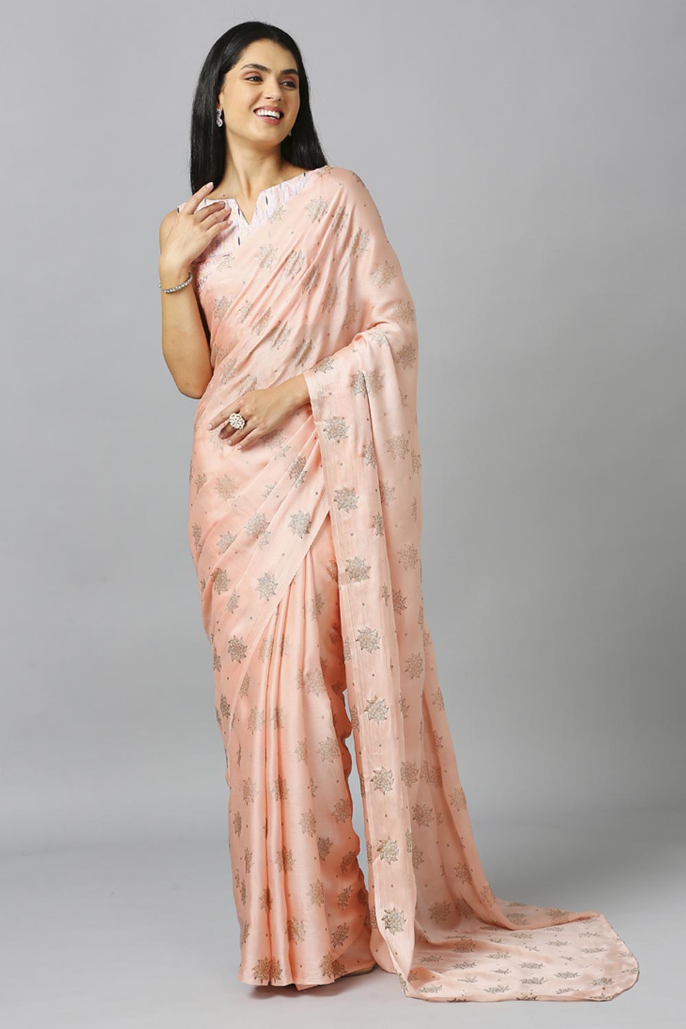 Light Peach Chiffon Resham Embroidery Party Wear Designer Saree