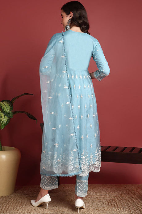 Blue Organza Solid Embroidered Anarkali Suit Set