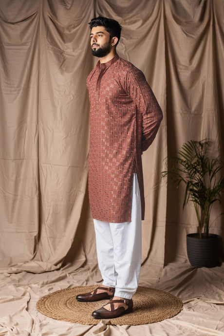 Men's Brown Embroidered Rayon Kurta Set