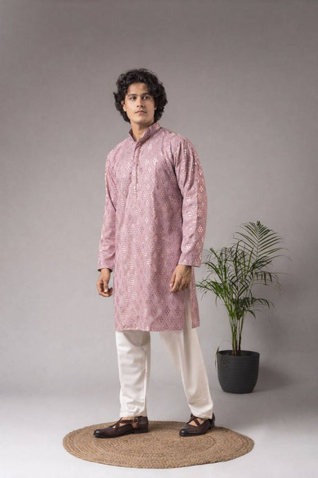 Men's Pink Embroidered Viscose Kurta Set