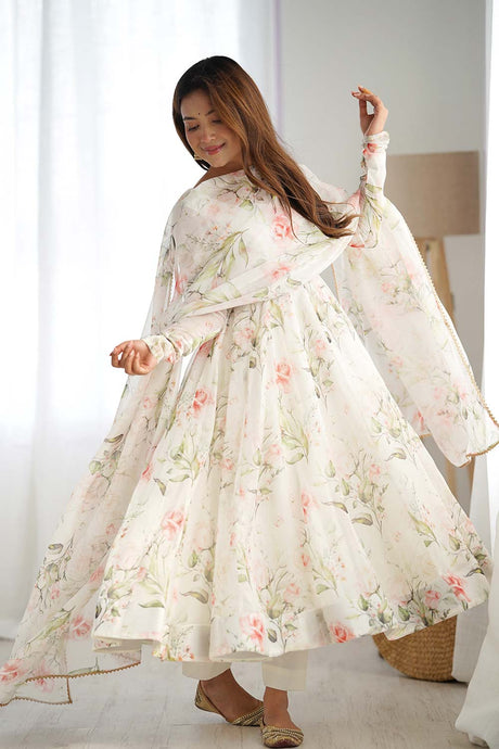 Cream Floral Anarkali Cotton Kurti Palazzo Set With Dupatta