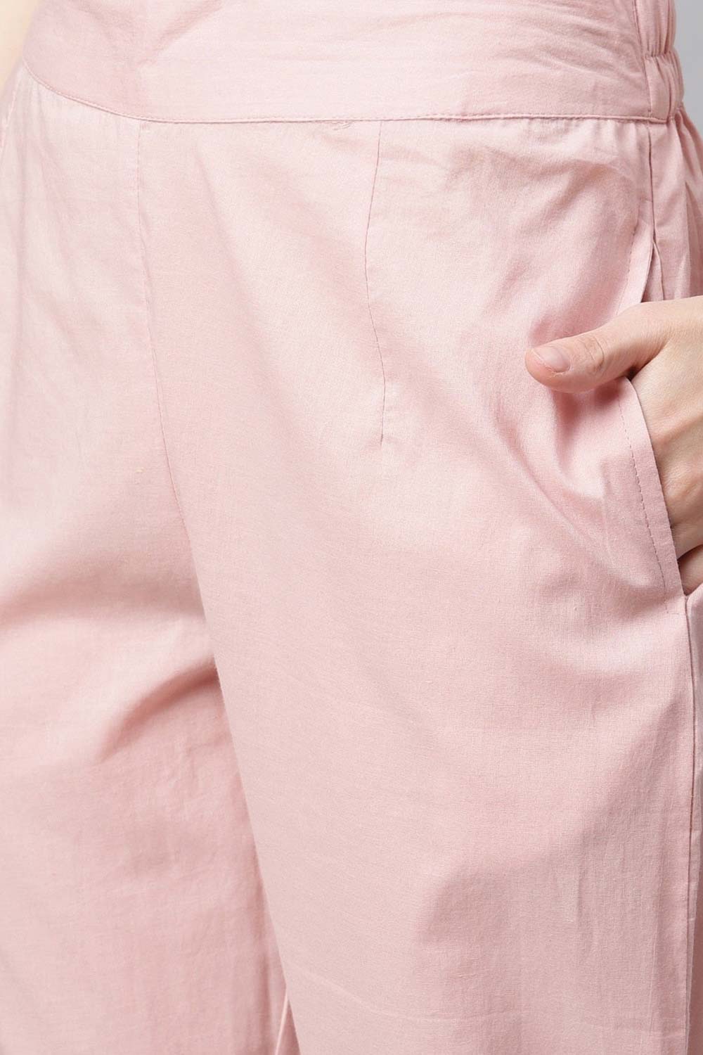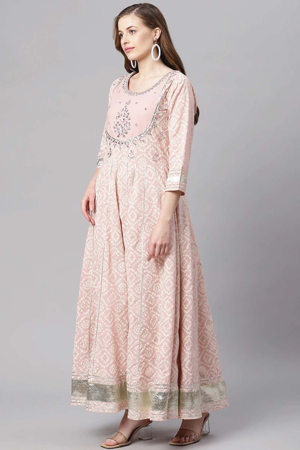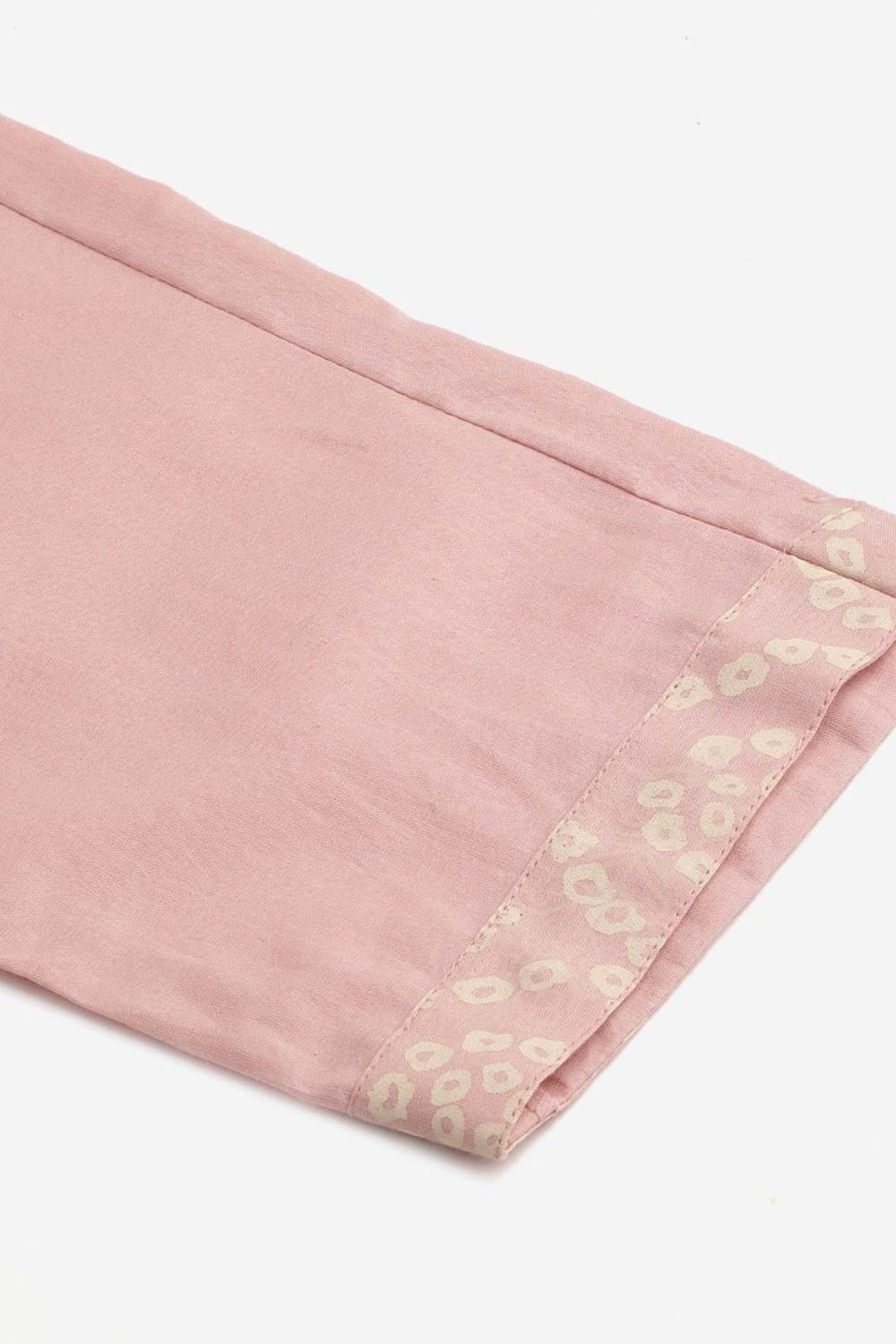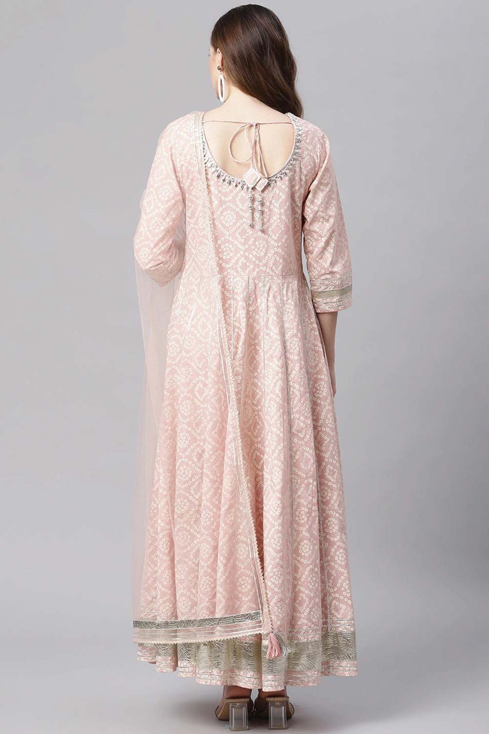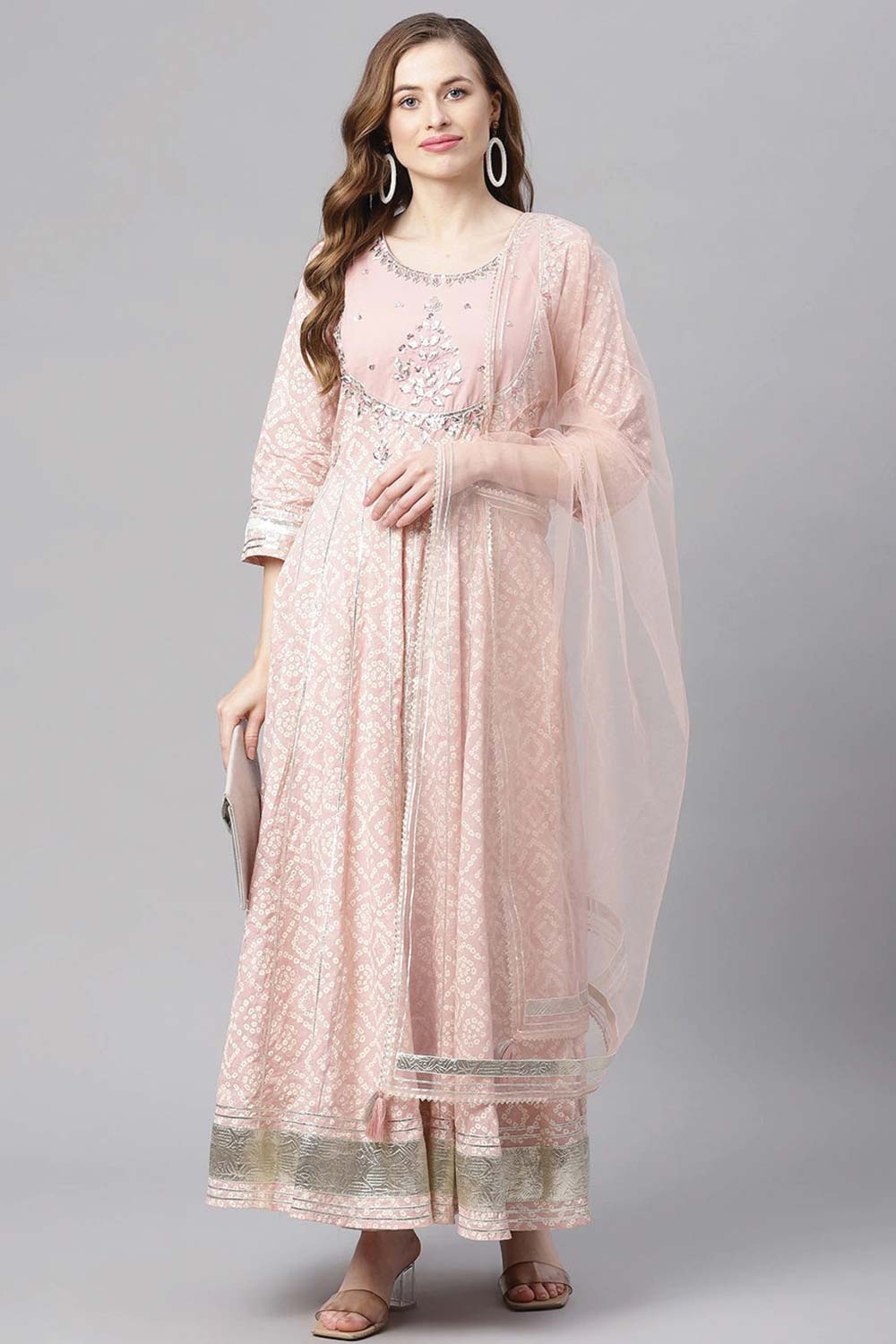 Light Pink Cotton Anarkali Gown Pant Set With Net Dupatta