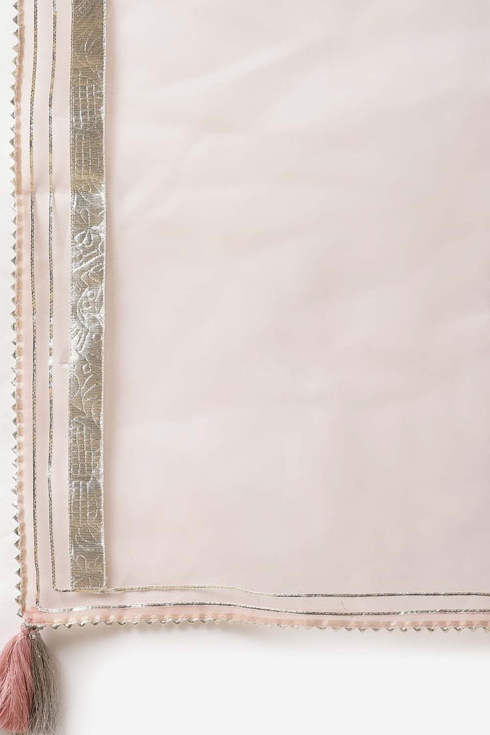 This grogerous set is your go-to for any event. Its Round neckline Covered with Gota patti work with back side tassels and its bandhani print gives a perfect ethnic look and net dupatta also covered with gota patti lace its perfect to make you the star of the any party. This suit with Solid baby pink pant wear chunky jewellery like heavy jhumkas for any function and you are ready to shine