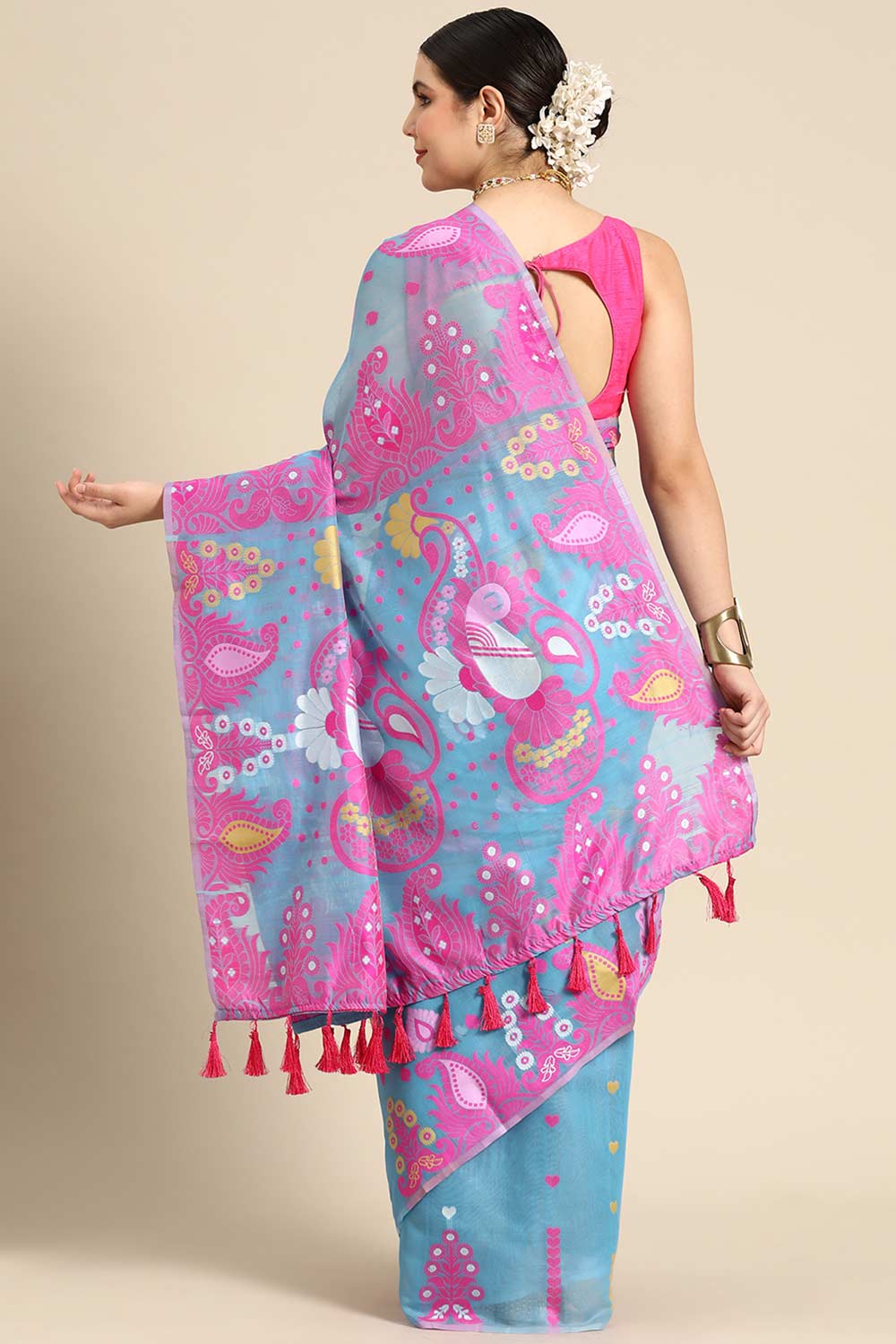 Elegant yet simple jamdani saree from Silk Land. Saree has a paisely and Floral design on pallu side for great look. There is no border.