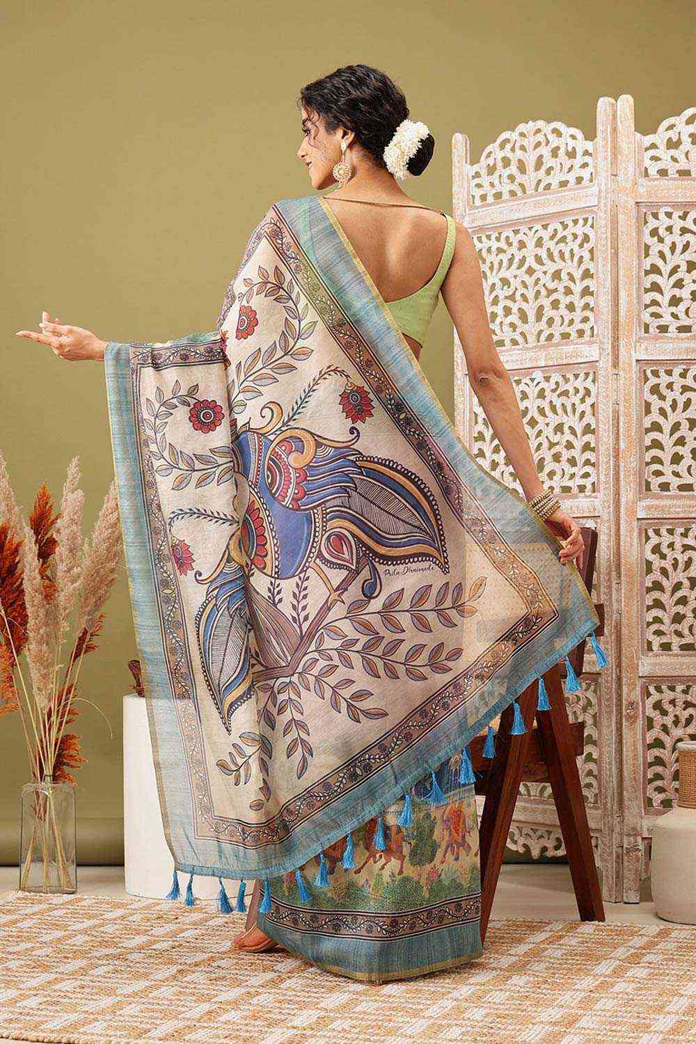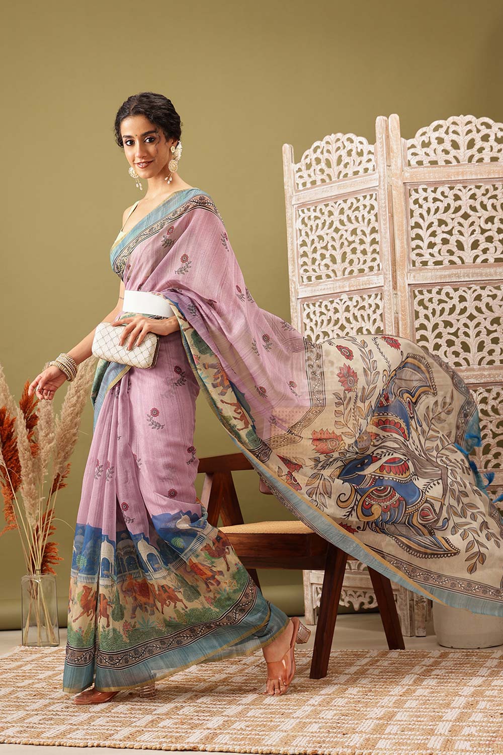 Adorn yourself in this Pink Cotton Blend Printed Madhubani Saree , featuring elegant woven motifs that add a touch of sophistication and classic charm to your wardrobe.
