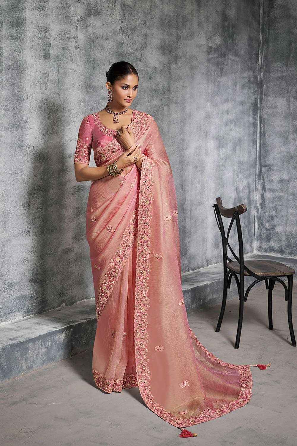 Elevate your wardrobe with our exquisite Saree, a masterpiece crafted to add timeless elegance to your style. Made from Tissue Silk this saree offers a perfect mix of comfort and sophistication. Adorned with Floral Embroidered it showcases intricate craftsmanship that speaks volumes of tradition and artistry. Perfect for Party this saree is a versatile addition to your collection, ensuring you stand out effortlessly. Pair it with elegant Jewelry, for a glamorous look. Add Clutches or Potli Bags and complete the ensemble with Wedges & Heels , making it a perfect choice for any event. Make a statement and embrace the elegance of Saree today
