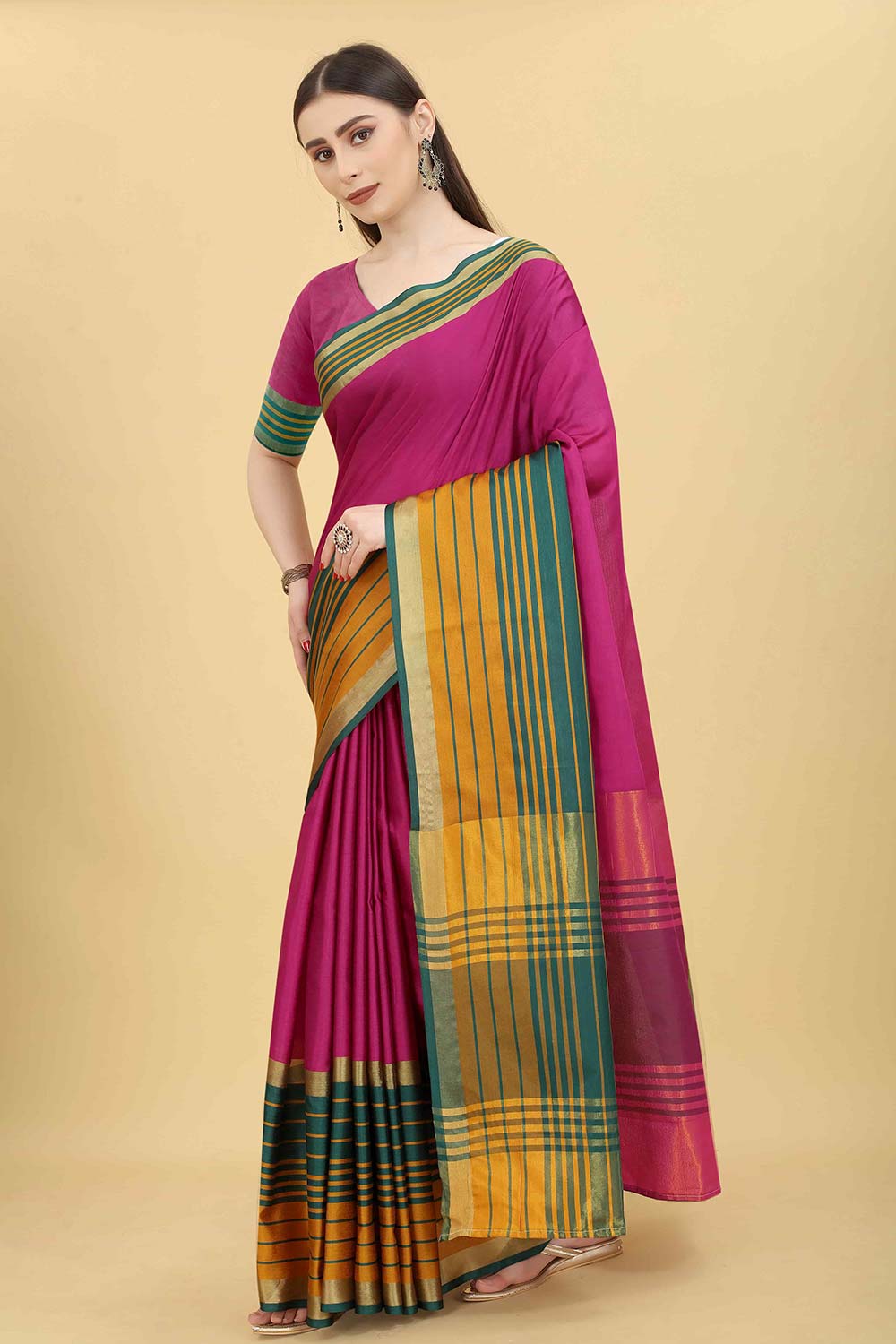 This saree has a embellished with a tassels, it has a solid touch all over the saree for it's great look. It has a contraste border with stripe with tessles. Perfect for the casual. Also this saree has light in weight.