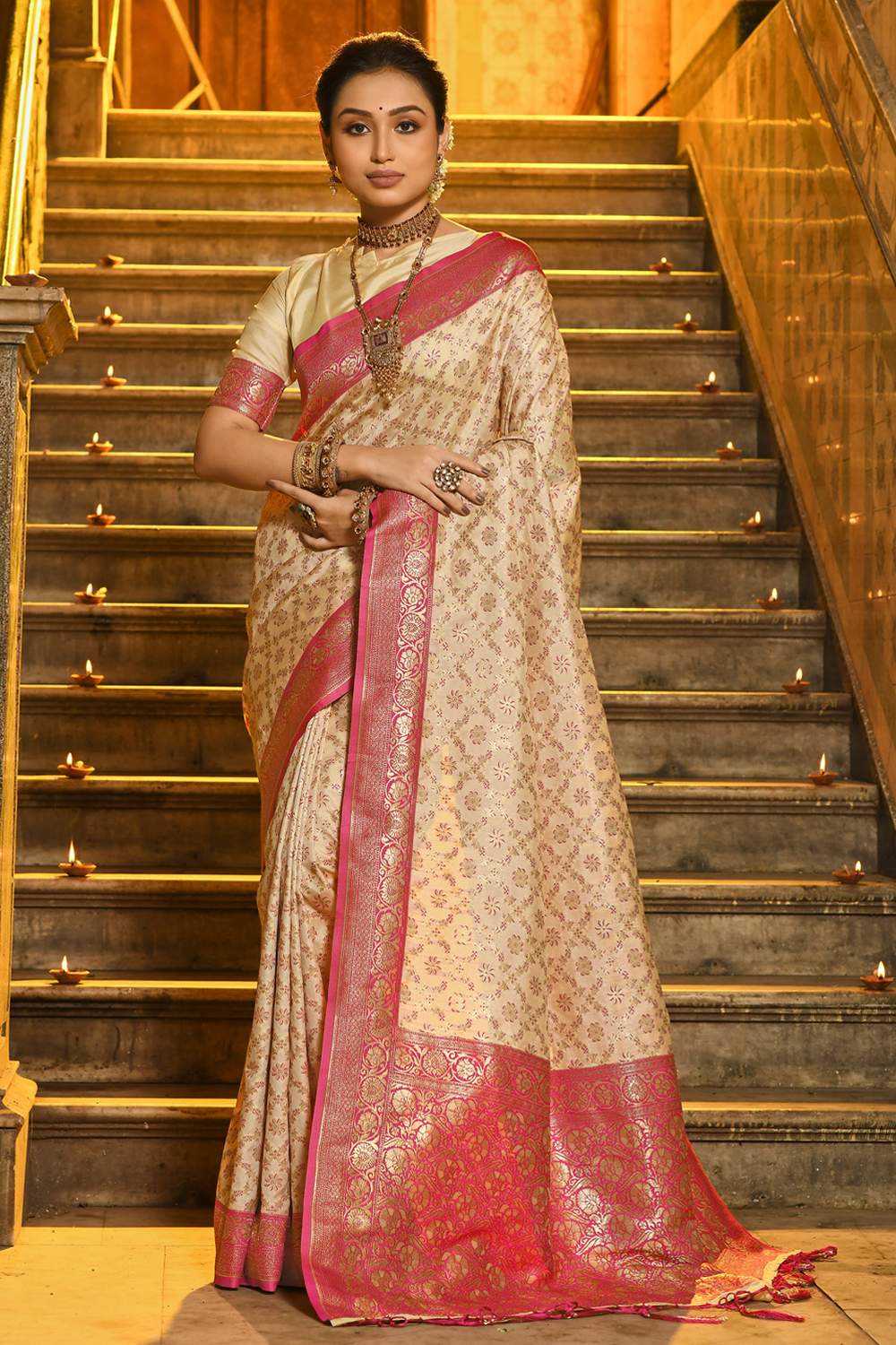 Elevate your wardrobe with our exquisite Saree a masterpiece crafted to add timeless elegance to your style. Made from Banarasi Silk this saree offers a perfect mix of comfort and sophistication. Adorned with Woven it showcases intricate craftsmanship that speaks volumes of tradition and artistry. Perfect for festivewear this saree is a versatile addition to your collection, ensuring you stand out effortlessly. Pair it with elegant Jewelry, for a glamorous look. Add Clutches or Potli Bags and complete the ensemble with Wedges & Heels , making it a perfect choice for any event. Make a statement and embrace the elegance of Saree today