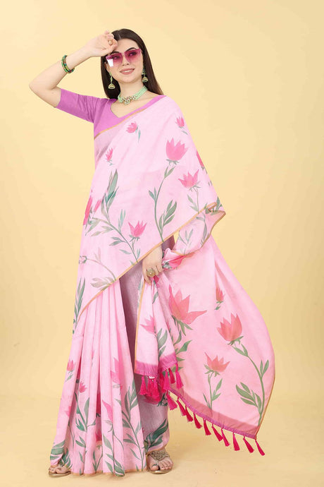 Pink Printed Cotton Blend Saree