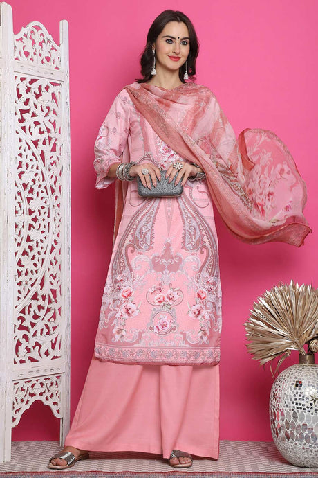 Pastel Pink Color Organza Glitter Printed Kurta Pant Set With Dupatta