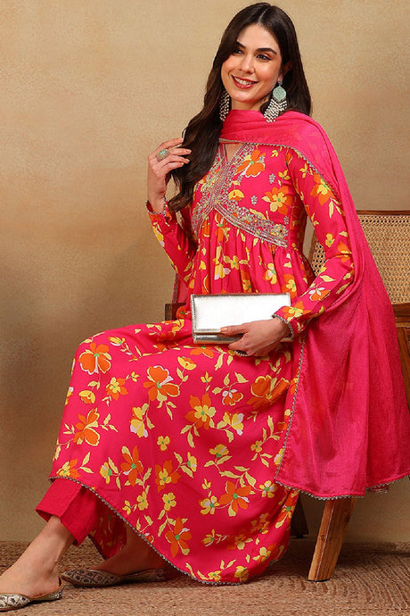 Pink Poly Georgette Floral Printed Flared Empire Anarkali Suit Set