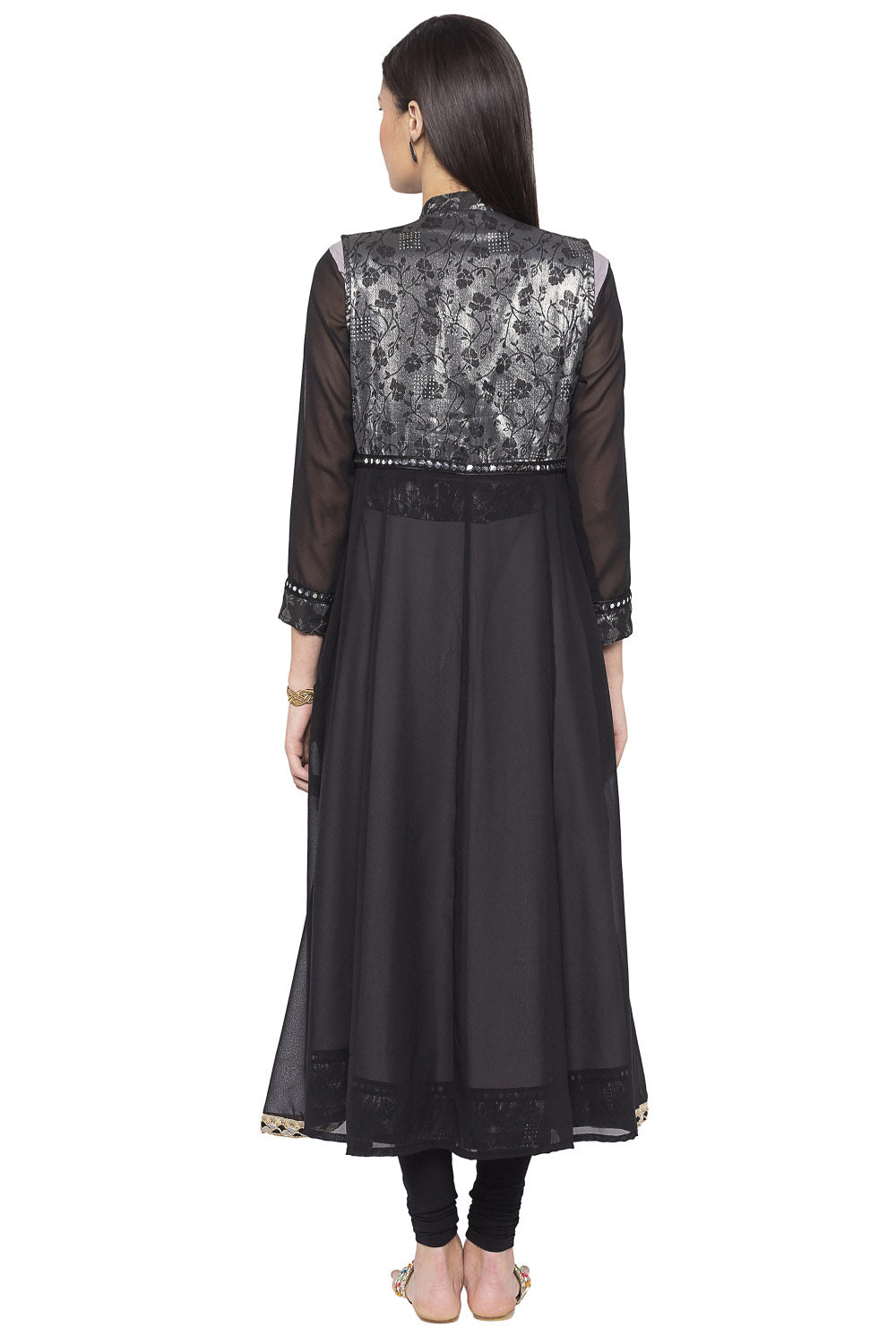 Grey American crepe flared Kurti with black georgette full sleeves worn with black box pleated flared long jacket having embroidery on front panel .Hemline and zardozi embroidery on shoulders with black shimmer fabric body line having mirror embroidery on waistline. Both front and back. Sleeves and hemline