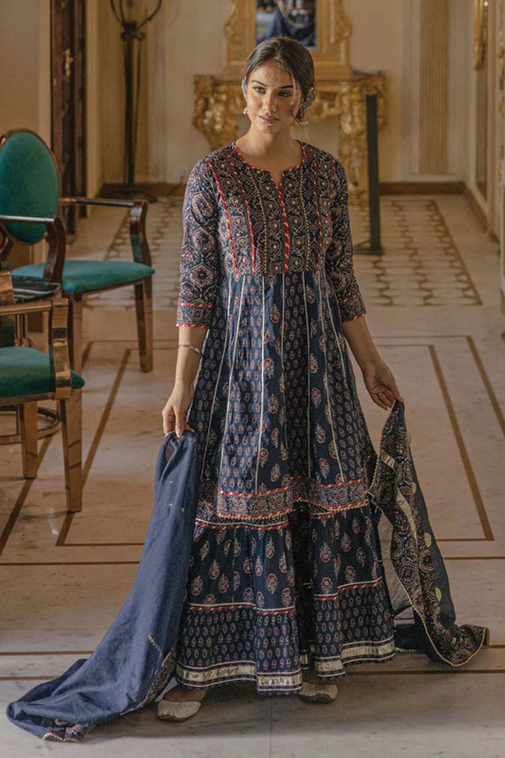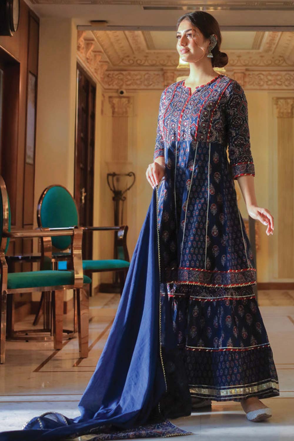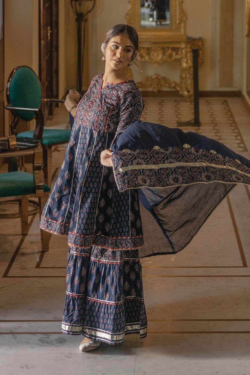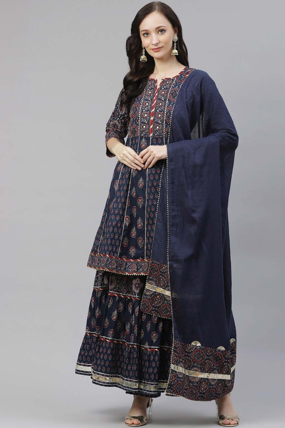Indigo Cotton Short Kurti Sharara Set With Dupatta