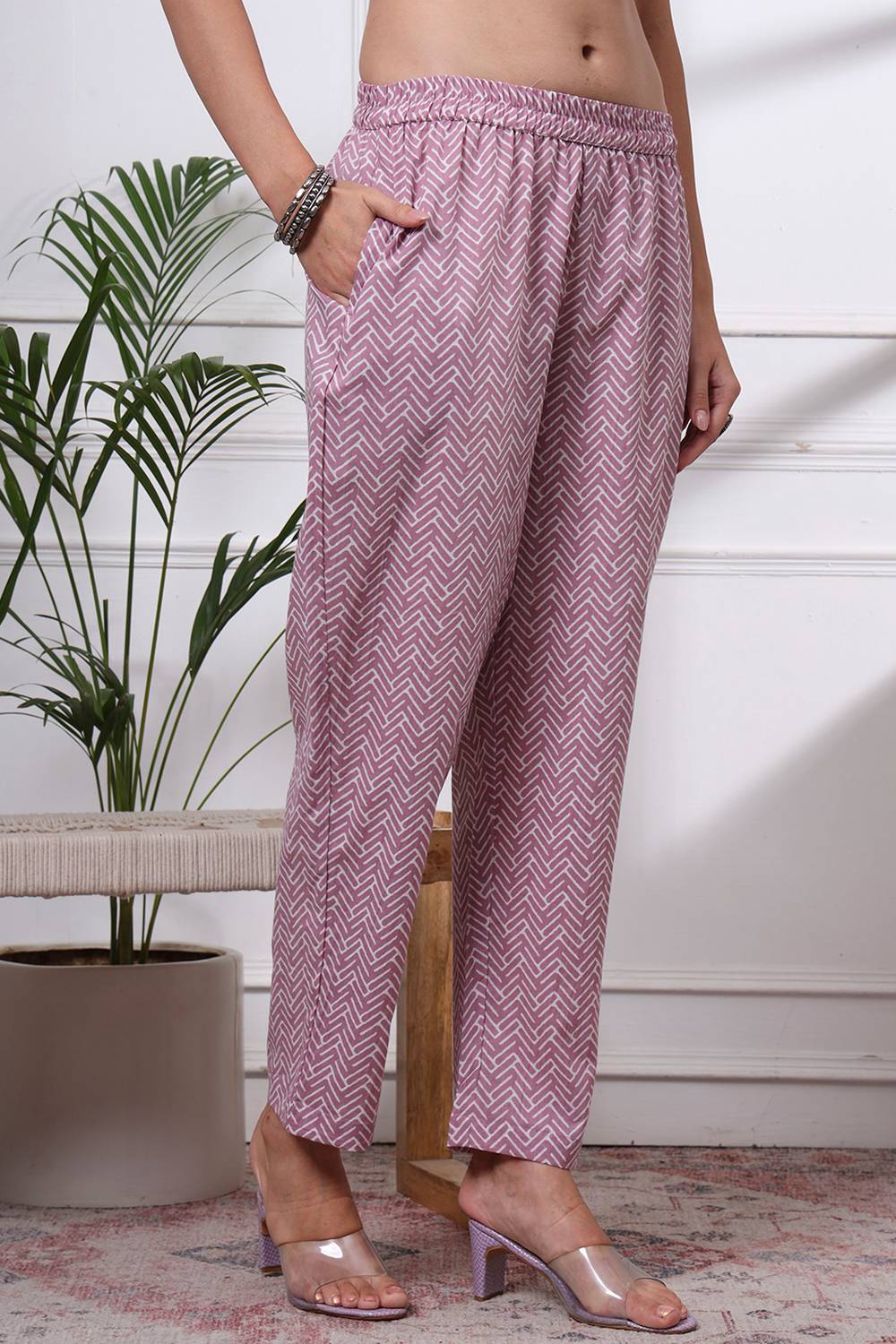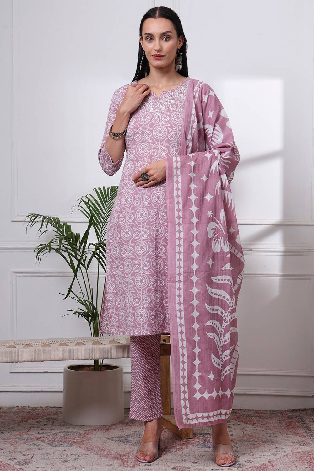 Mauve Floral Printed Cotton Straight Cut Suit Set