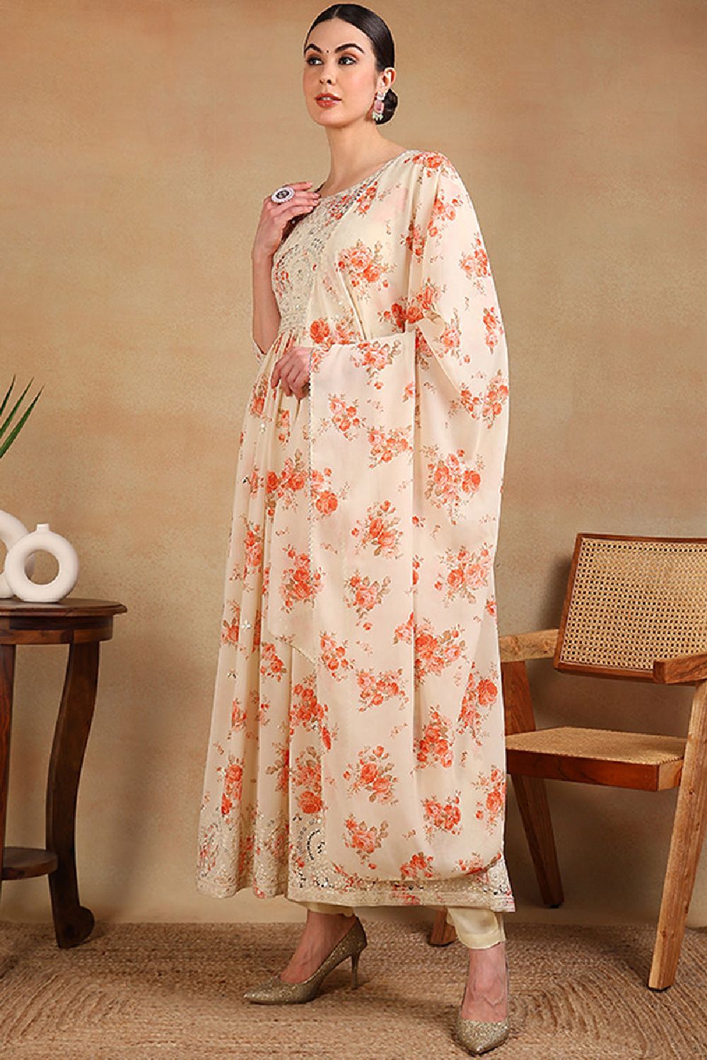 Off White Georgette Floral Printed Flared Anarkali Suit Set