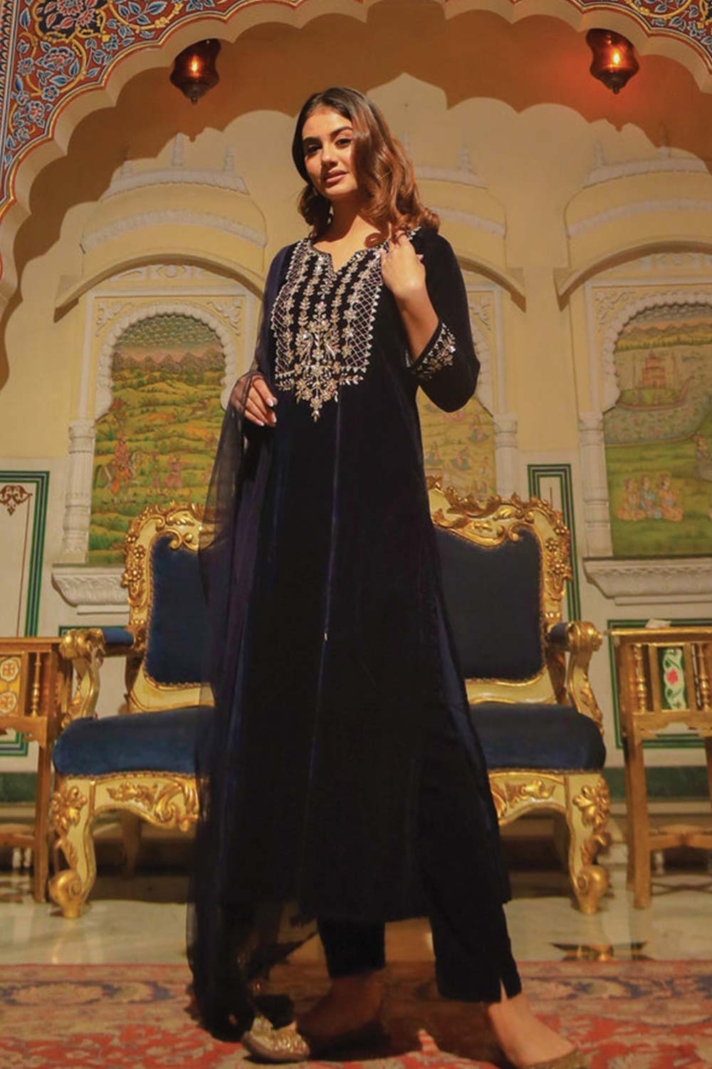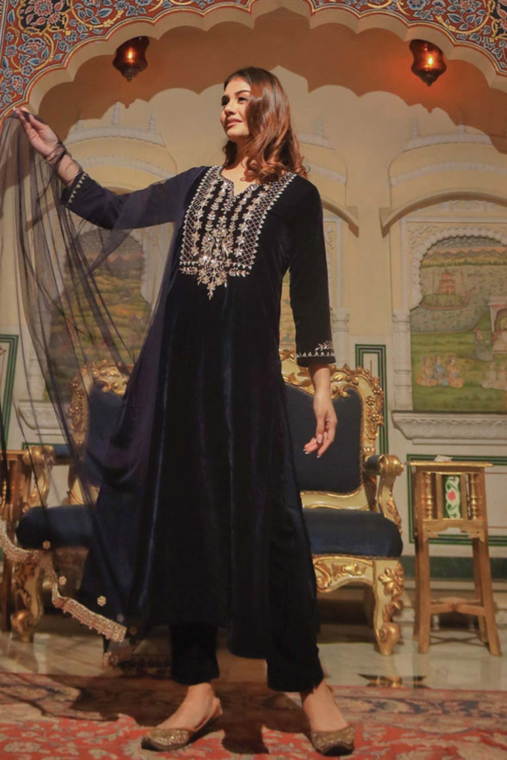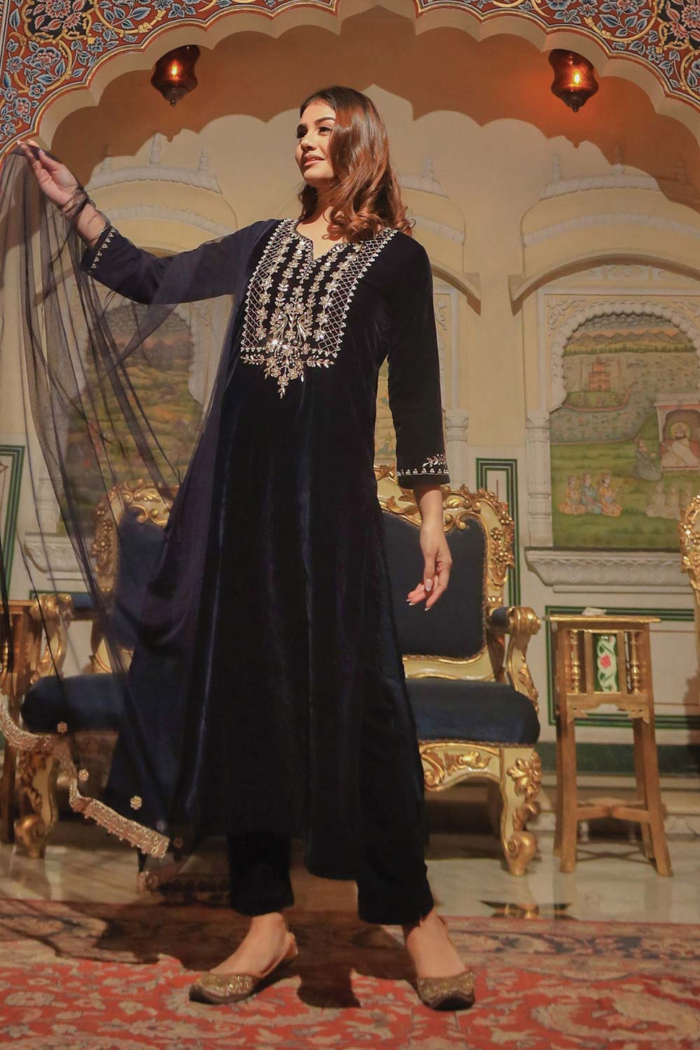 Royal Blue Velvet Hand Work Kurta Pant With Net Dupatta Set