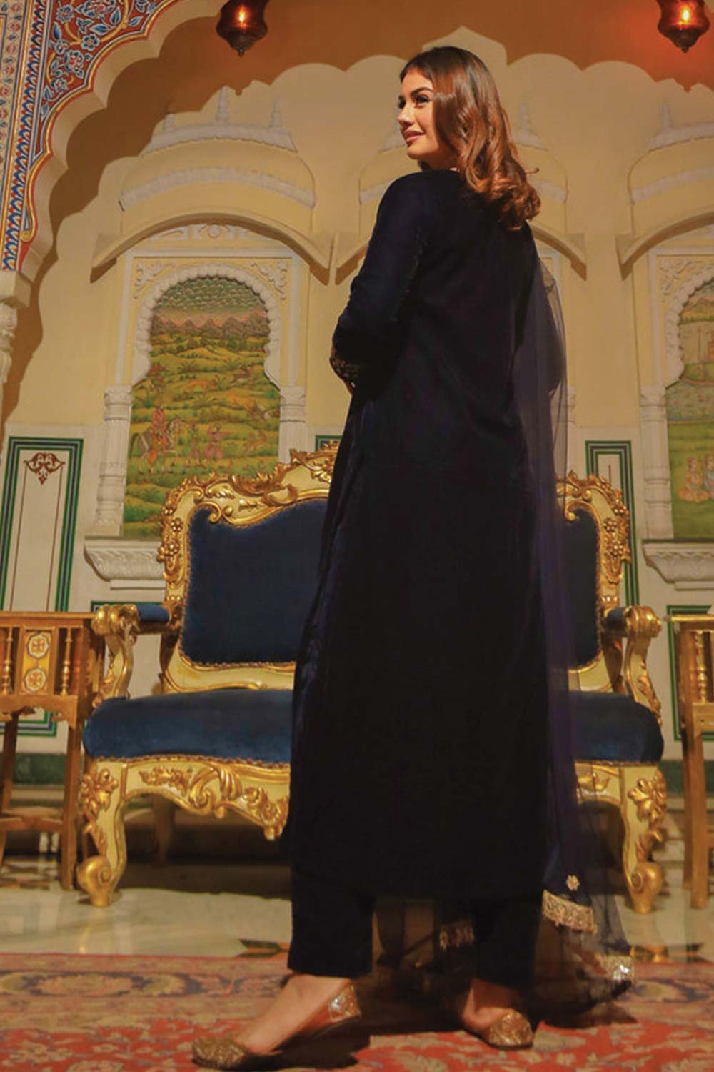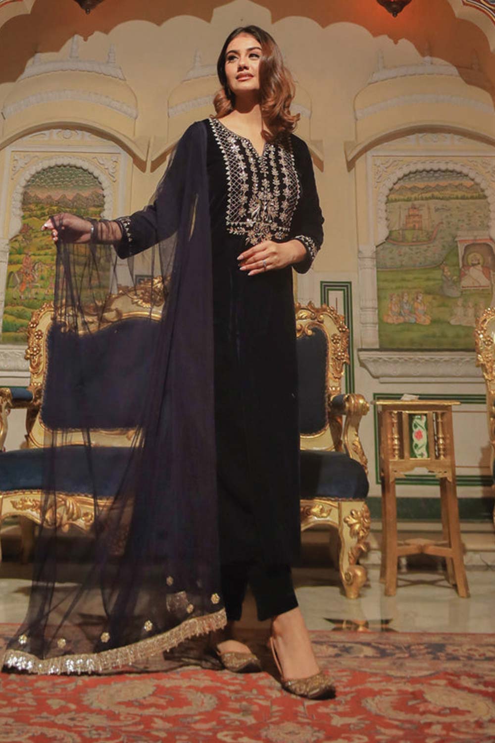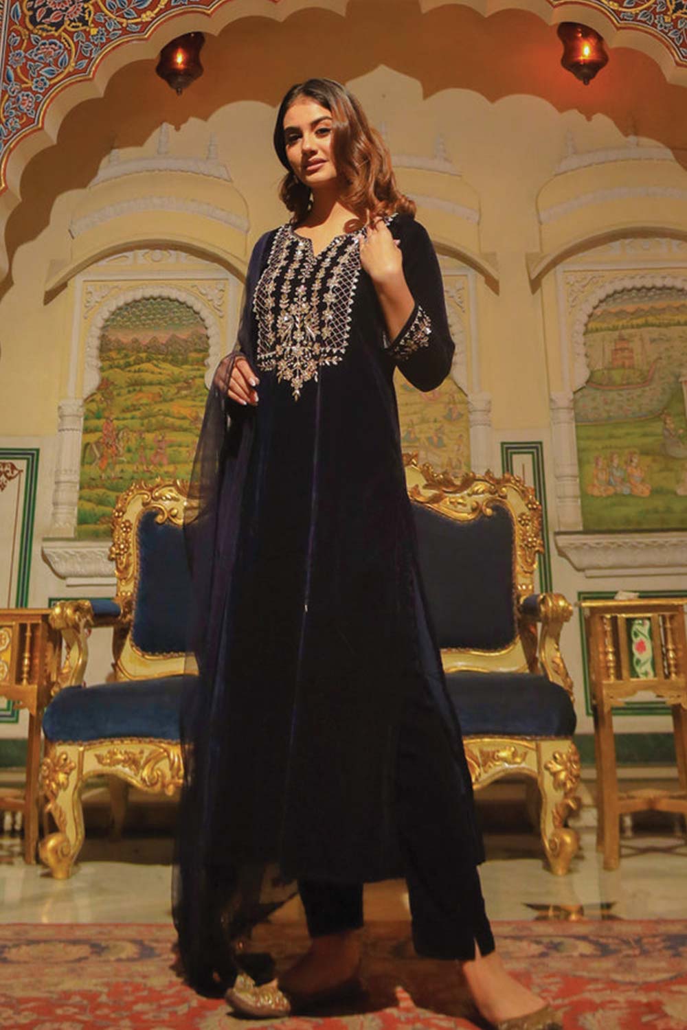 Royal Blue Velvet Hand Work Kurta Pant With Net Dupatta Set