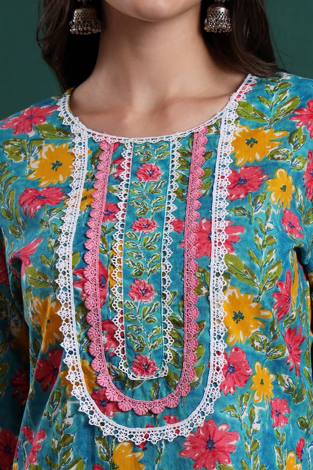 Turquoise Floral Printed Cotton Straight Cut Suit Set