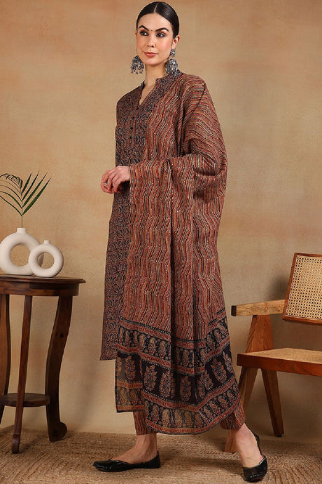 Navy Blue Rayon Blend Ethnic Motifs Printed Straight Cut Suit Set
