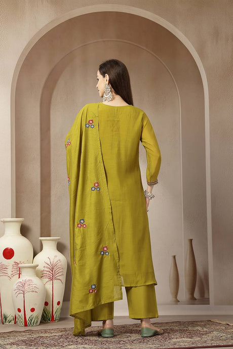 Olive Green Silk Blend Solid Embroidered Straight Cut Suit Set